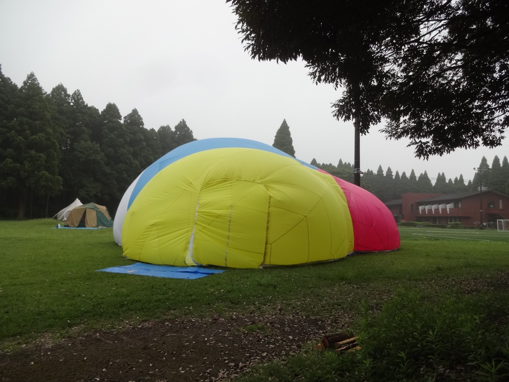 今日の昭和の森は曇っています。 とても蒸し暑いです。 昭和の森フォレストビレッジでは、 キャンプが賑わっています。 芝生フリーサイトで大きなテントを見つけました。 カラフルでぷっくらしています。 家族用テント10張りくらいの大きさでしょうか。 何に使うのですかね。