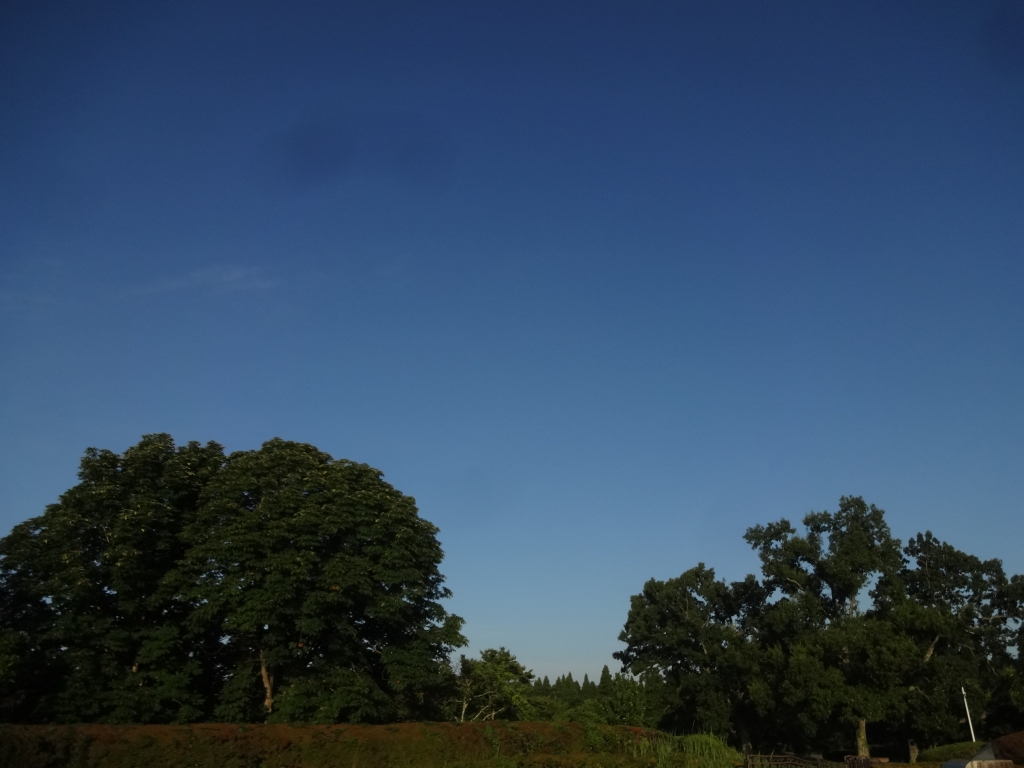 今朝の昭和の森は晴れています。 蒸し暑いです。 台風の接近により午後からは天気が崩れそうです。 日が昇るにつれて雲が増えてきましたが、 早朝の、快晴の青空1枚です。