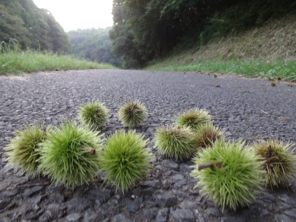 今日の昭和の森は曇っています。 また数日こんな天気ですかね。 低気圧が日本列島を移動中です。 栗の実が育っています。 しかし、残念ながら雨や風のために落ちた実が多数。 園路の上に転がっていました。 踏みつけないよう、ご注意ください。