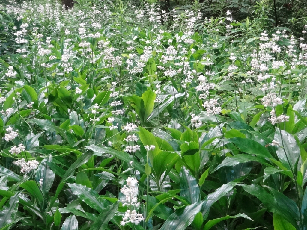 今日の昭和の森は雨です。 早朝は、まだ曇りだったのですが、 次第に雨になってきました。 今週は梅雨のようです。 空梅雨が明けたばかりだというのに。 梅雨前線が南下してきたのですね。 ヤブミョウガの白い花が、まだまだ咲いています。 石楠花の道の両脇に見事に群生しています。