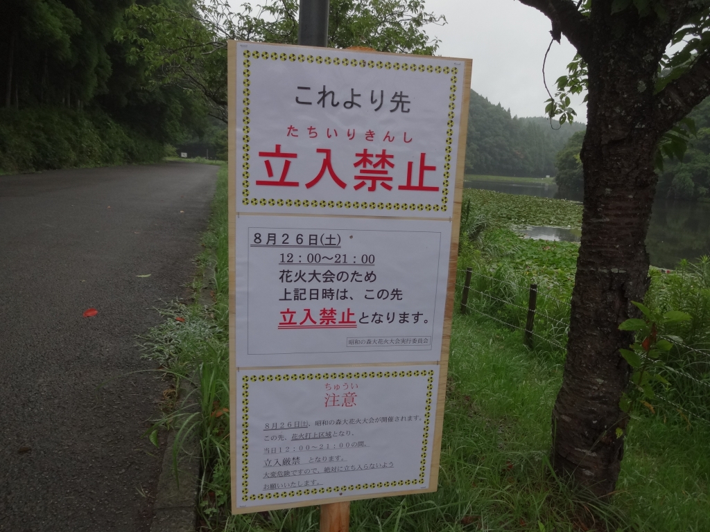 今日の昭和の森は、小雨模様。 早朝、少しだけ雨が上がっていました。 また降りだしたのですが、午後にはあがるようです。 涼しくてすごしやすいです。 下タ田池の入口にこんな立札が立っていました。 何かの工事で「立入禁止」なのかと驚きました。 しかし、よく見てみると、 8月26日の「昭和の森大花火大会」に関するものです。 この先で花火を打ち上げるので立入禁止とのことです。 しかし、ちょっと早過ぎですね。 1週間前くらいから掲示で良いのではないでしょうか。 &nb...