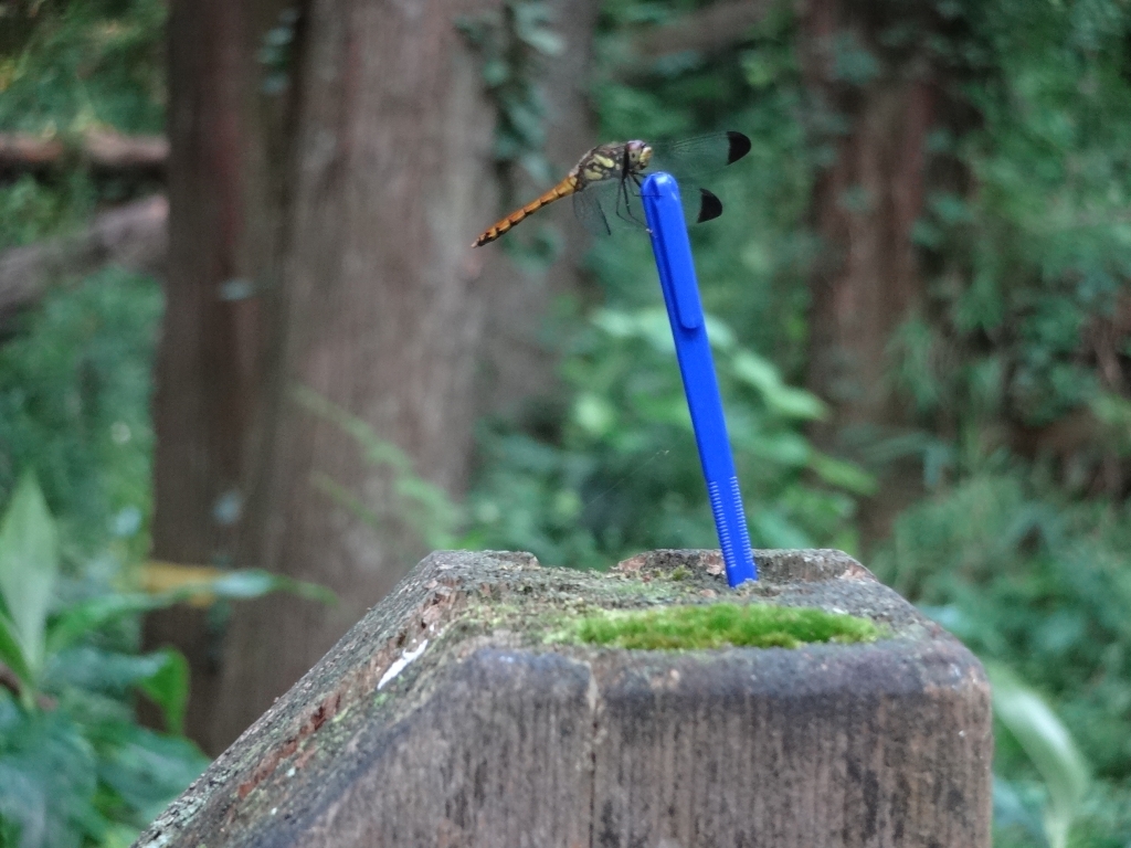 今日の昭和の森は晴れています。 少し風が吹いていますが、暑いです。 トンボ、と言えば鉛筆ですが、 虫のトンボがボールペンのキャップ側にとまっていました。 このボールペン、案内柱の上部に刺さっていました。 場違いですね。 軽いいたずらだと思いますが、 ゴミならゴミ箱に入れてくださいね。