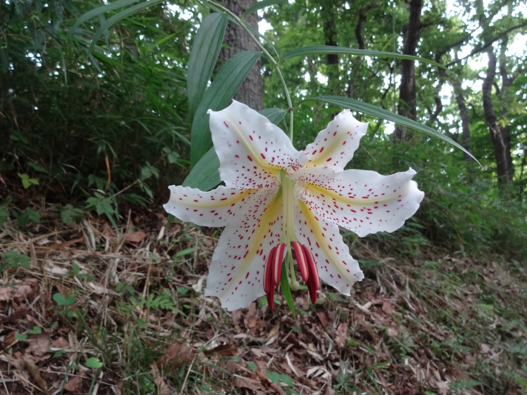 今日の昭和の森は曇っています。 とても蒸し暑いです。 夜の間も気温が下がりませんでした。 泉自然公園では、1週間ほど前から咲き始めたようですが、 ここ昭和の森でもやっと咲き始めました。 若葉区と緑区では、少し気温が違うのでしょうか。 ヤマユリの多くは支柱に支持されているのですが、 いくつかは手が加えられていません。