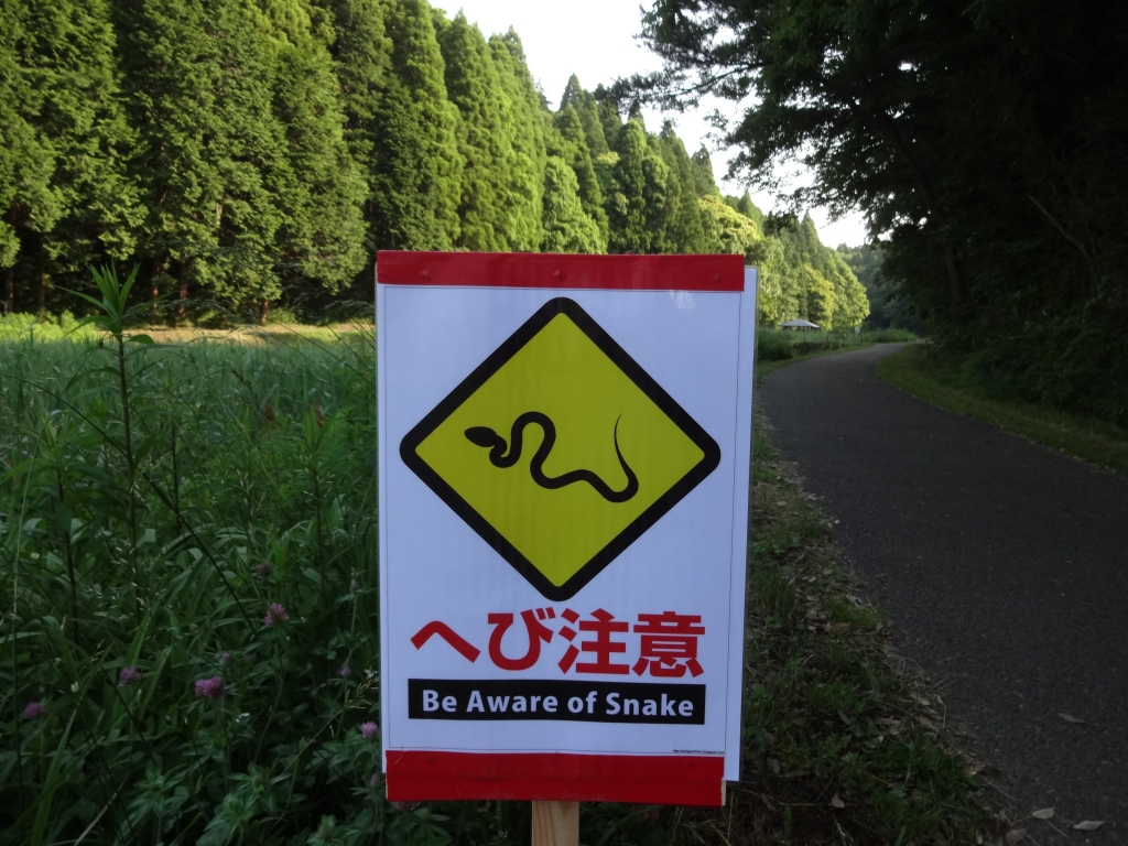 今日の昭和の森は晴れています。 爽やかな気候です。 暑くなってくると、色々と出てきます。 虫だけではありません。 ヘビです。 こんな立札は初登場ではないでしょうか。 珍しく英語訳も付いています。 ヘビは森だけでなくあちこちに出てくるので、 ご注意ください。