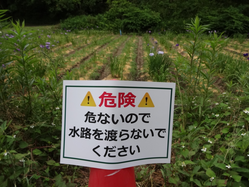 今日の昭和の森は、薄曇りです。 少し風が吹き、気温は高くありません。 花菖蒲が盛りの湿性植物園にこんな立札があります。 「危ないので水路を渡らないで」 きれいな花に誘われて、 子供でなくても大人がつい入っていくのが見受けられます。 近くで見たい、写真を撮りたいという思いがあるのでしょうが、 危険なだけでなく植物を傷つける恐れがあります。 横の遊歩道や木道からゆったりと観賞しましょう。