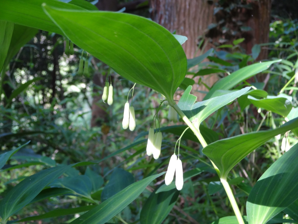 今日の昭和の森は晴れています。 雲が多く浮かんでいます。 暑さは少し和らいでいます。 ナルコユリです。 林間の足元にひっそり咲く花はいいですね。 花が下向きなので、注意してないと見逃します。 ナルコは、「鳴子」と書きます。 田畑の鳥よけの鳴り物の形から来たそうです。