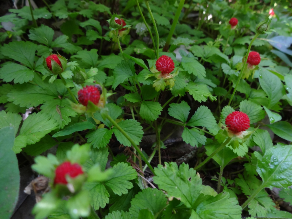 今日の昭和の森は曇っています。 風は弱く、蒸し暑いです。 林間に入ると涼しいのですが、 足元を見ると、赤い球がプツプツと点在しています。 ヘビイチゴです。 緑の中に赤、いい色の組合わせです。