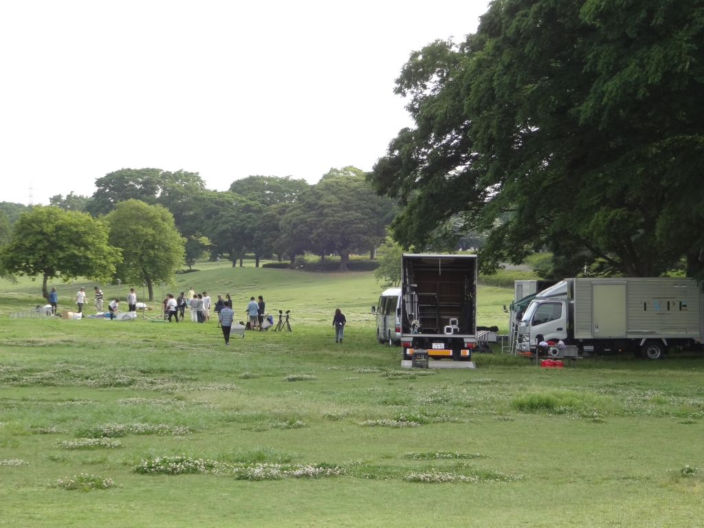 今日の昭和の森は晴れています。 穏やかです。 湿度が高く、蒸し暑くなってきそうです。 太陽の広場の真ん中にトラックと人の群れが見えます。 芝生が傷まないように侵入したのでしょうか。 先日もありましたが、 太陽の広場では、早朝に撮影が行われていたようです。 ひと気を避けてのことでしょう。 撮影隊に多い若者は、朝起きに弱いと思いましたが、 夜明けの4時半に間に合うように都内から来るとなると、 徹夜に近い感じでしょうか。