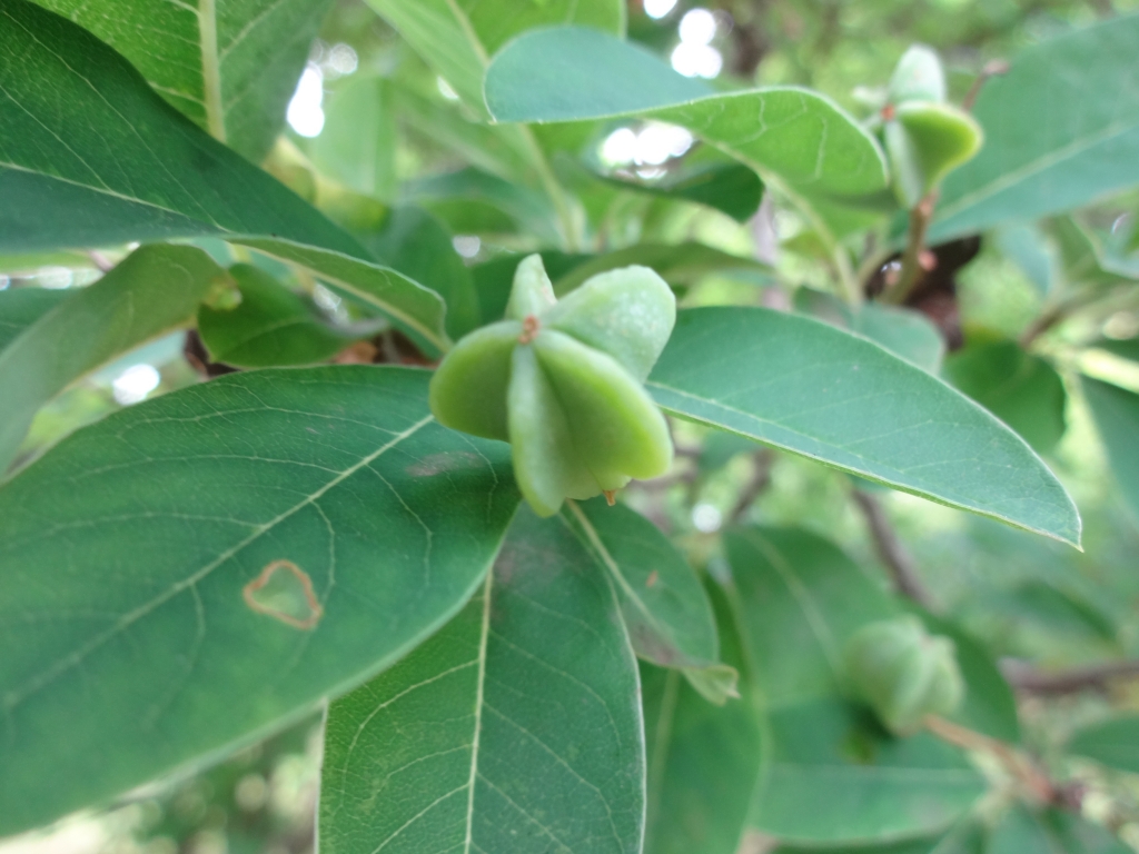 今日の昭和の森は曇っています。 朝方は、雨がぱらついていました。 気温は高くありませんが、湿度が高いです。 春に白い花を咲かせるリキュウバイの実です。 五角形のような面白い形をしています。 この「リキュウ」は、「利久」と書くのが正しいようですが、 茶花(ちゃばな)として用いられることから 茶人の千利休にちなんで「利休」とも書かれるそうです。 また、別名を「バイカシモツケ」と言うので ややこしいですね。