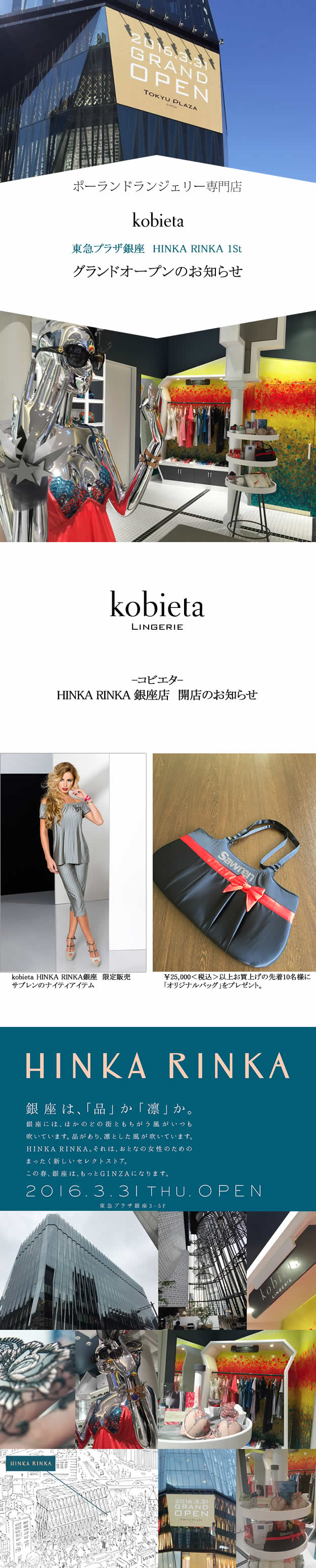 [ポーランドランジェリーセレクトショップ] kobieta -コビエタ- HINKA RINKA 銀座店 グランドオープン! 株式会社アヴァンサは、3月31日にグランドオープンする「東急プラザ銀座」内のセレクトショップ 「HINKA RINKA銀座店」に、直営のセレクトショップ「kobieta-コビエタ-」を出店します。 日本初のポーランドランジェリー専門セレクトショップです。 取扱商品は、Sawren(サブレン)のスリップ、ナイティ、ショーツなどが中心ですが これまで直営のオンラインショップ「SPLASH」でしか買えなかった商品をお買い...