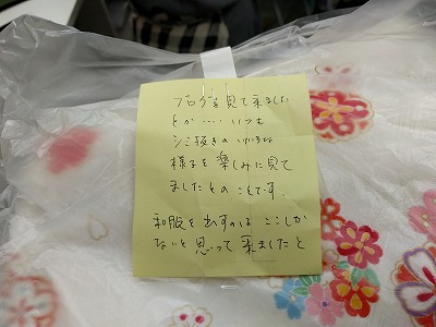 JUGEMテーマ:町田 JUGEMテーマ:モブログ こんにちは、不入流(いらずりゅう)染み抜き師範 東京都町田市の【むらかみクリーニング】【洗濯職人】染み抜き係りの『のぶ』です。 昨日、染み抜き教室でしたが寒かった〜一日中雨も降っててホント寒かったですね!あっ、傘どこかに忘れてきた 先日お店に持ち込まれた着物です。メモ書きが・・・ ブログみてくれてるお客様らしいです〖いつもシミ抜きの様子楽しみに見ています〗とのこと 嬉しいですね〜見てくれてる人いるんだな〜と実感w 和服を出すな...
