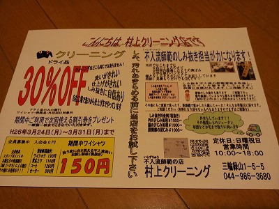JUGEMテーマ:モブログ こんにちは、不入流(いらずりゅう)染み抜き師範【むらかみクリーニング】【洗濯職人】染み抜き係りの『のぶ』です。 染み抜きのネタではないんですが、昨日今日と学生服の急ぎが多いのですが、月曜日から新年度が始まるんですね。 洗濯職人では今日はもちろん明日6日(日)の12時までにお預かりで即日17時渡しできます。 緑山店は本日12時までに受付で即日17時半渡しです(注:緑山店は日曜定休) それではまた ノシ 遠方の...