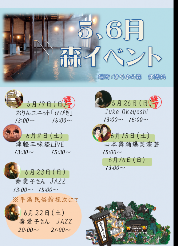 JUGEMテーマ:岐阜県の何でも情報   雨が多い6月に、ご来館のお客様に楽しんでいただけるため、いろんなイベントを開催させて頂きます。   6/8(土) 津軽三味線演奏 ひらゆの森 大広間の休憩場にて 13:30〜 / 15:30〜  の2回   6/15(土) 山本舞踊爆笑演劇 ひらゆの森 大広間の休憩場にて 15:00〜の1回 6/16(日) 山本舞踊爆笑演劇 ひらゆの森 大広間の休憩場にて 13:00〜の1回   6/22(土) 秦愛子さん JAZZ LIVE ※平湯民俗館お食事処禄次にて 20:00〜 / 21:...