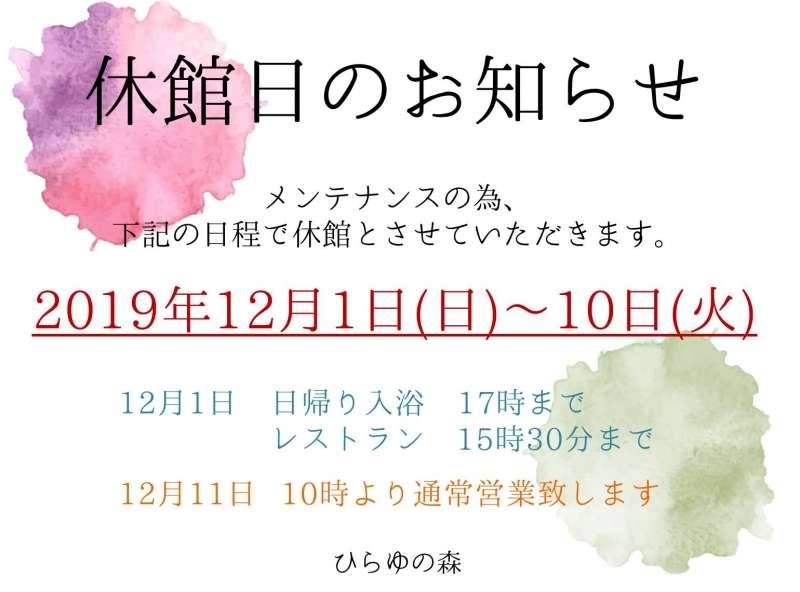 いつもひらゆの森をご利用いただき、誠にありがとうございます! 12月の休館日お知らせ致します。 当館 ∦∦12月1日(日)~10日(火)の十日間∦∦、 リニューアル工事を兼たメンテナンスのため、休館とさせていただきます。 12月1日、 日帰り入浴は17時まで、 レストランもみの木はラストオーダー15時、15時30分まで営業致しております。 あんき屋 ラストオーダー13時30分 14時まで 平湯民俗館禄次 17時まで(露天風呂は通常営業) 12月11日営業時間のご案内 ひらゆの森 10時より もみ...
