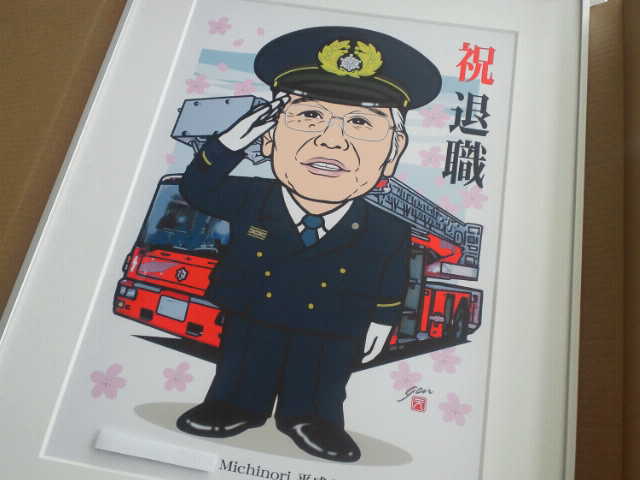 ●消防士の退職祝い「鈴木ゲンお祝い似顔絵」の贈り物消防士、消防官、消防隊、消防団、消防職員の退職記念やご勇退祝い。還暦祝い退職祝い記念品、お祝い贈答品似顔絵の贈り物。制服姿で消防車など描く記念似顔絵鈴木ゲン作品です。「詳しくはHPご覧下さい」●お見積りとご注文依頼「鈴木ゲンお祝い似顔絵」JUGEMテーマ:大阪の地域情報