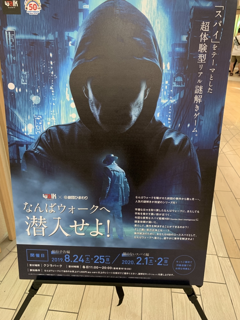 8月の終盤の土日と言えば日テレ系列の24時間テレビですが。 所要でなんばウォークを歩いていたらクジラの広場に行列ができていました。 「何々、イベント?」と思って近づくと、、 リアル謎解きゲームですって! ほぉーなんだか面白そうじゃああーりませんか。 時間がなかったからスルーしましたけど。 ファミコンやスマホゲームも良いけど、令和だからこそリアルゲームが面白いのかもね。 JUGEMテーマ:大阪