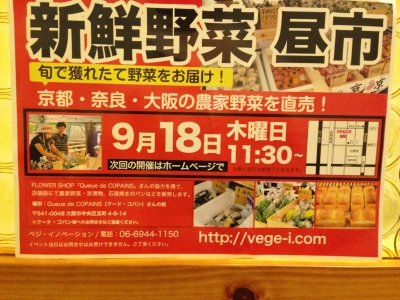 大阪、本町〜淀屋橋の デトックス&アロマフェイシャルサロン emptieのサキです。 本日(9月18日)11:30〜 瓦町4丁目の抜群にセンスのいいお花屋さん、 クード・コパンさん前で 限定ショップの八百屋さんが 出るそうです。 ビジネス街のど真ん中、本町で 市が開かれるなんて新鮮! サキも行きたいけれど 用事でお休みするので 次回開催されるまで(あるのかわかんないけど) お預けです。。 お昼休みは盛況でしょうね〜 お野菜が高くなっている昨今、 どうせなら中間マージンなしで 美味しく新鮮な野菜は...