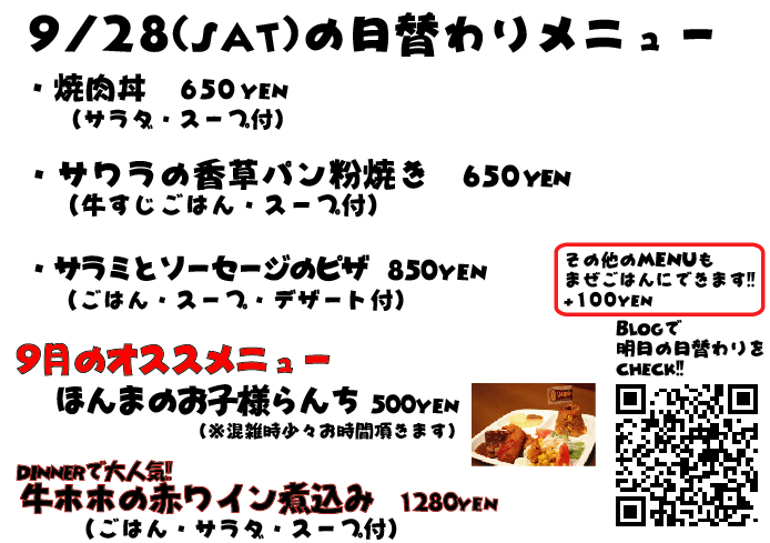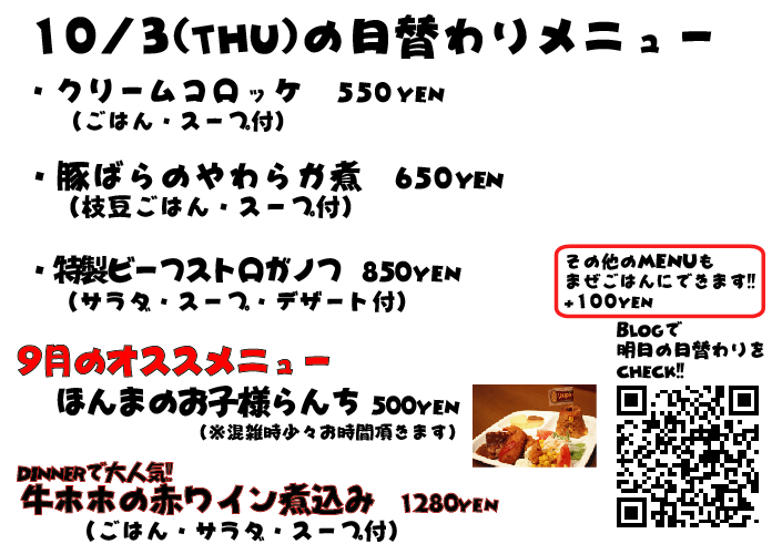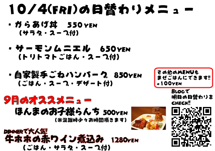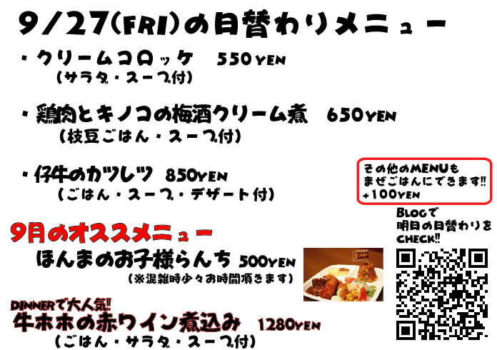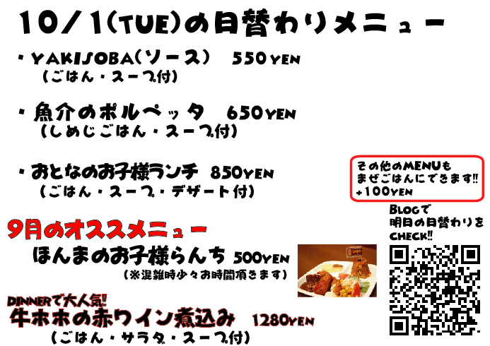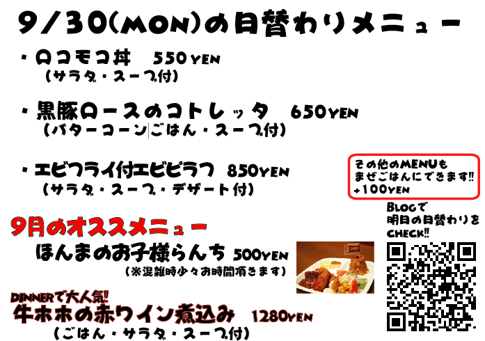 JUGEMテーマ:神戸・西宮・芦屋などの阪神間 こんばんは今日で9月も終わりですね、早いですね明日から10月って、あたりまえのことなんですが...w10月も引き締めて頑張りたいと思ってますのでよろしくお願い致しますm(._.)m明日も日替わりランチよろしくお願い致します
