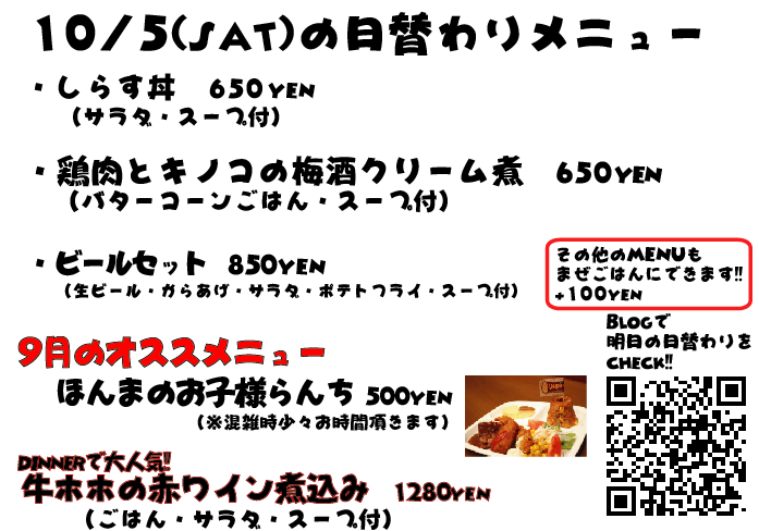 JUGEMテーマ:神戸・西宮・芦屋などの阪神間 こんばんは台風なんとかそれたみたいですが、雨は50%と微妙な感じの明日明後日ですが...明日も元気に営業にしております!ぜひっ!!それからそれから!10月中旬〜下旬にかけてDinnerのメニューが変わります、けっこう変わるかもしれませんそちらも追って報告していきたいと思いますのでよろしくお願い致します明日の日替わりランチは、「ビールセット」これちょーオススメ生ビール、からあげ、ポテト、サラダ、スープ全部入って850yen昼からこんな感じもいいのではないでしょ...
