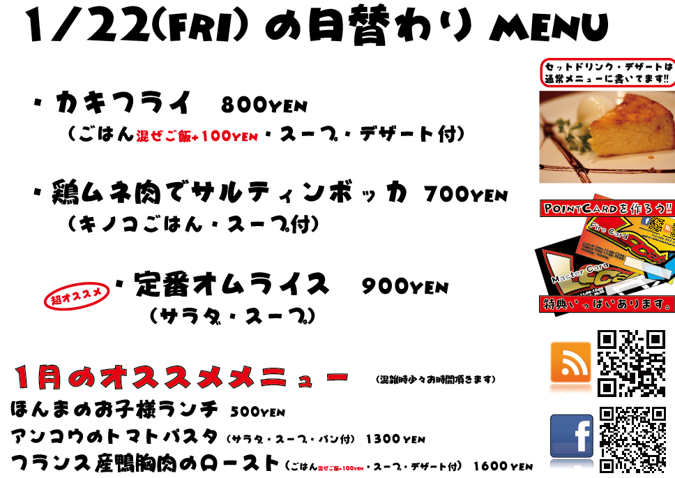 JUGEMテーマ:神戸・西宮・芦屋などの阪神間 こんばんは 今日もありがとうございましたm(.¥.)m 昨日からメニューブックをもう少し見やすくしようと思い、 只今、メニューの作りこみをしておりまして、ほぼ1日それにかかっております...なかなか大変でございます(笑 がんばっていい物を作りますのでそれもまた楽しみにして頂ければと思います^^ 明日は金曜日でございます! 仕事終わりにぜひ立ち寄ってくださいね〜