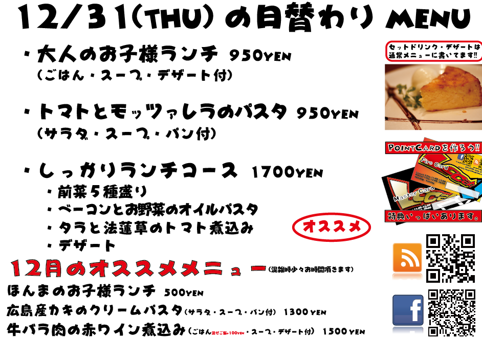 JUGEMテーマ:神戸・西宮・芦屋などの阪神間 こんばんは! 今年も皆様、たくさんのお運びありがとうございました!m(._.)m 今年もたくさんの方に支えられ、無事に年を越すことができそうです! 来年も今年以上に皆様に楽しんで頂けるような企画やメニューを考えて行きたいなと思いますっ 来年もひとつ、よろしくお願い致しますそして、来年も皆様にとって良いお年になるよう心から願っておりますm(._.)m 新年は、4日より営業します!1〜3日まではお休みを頂いておりますのでよろしくお願い致します