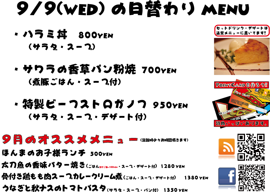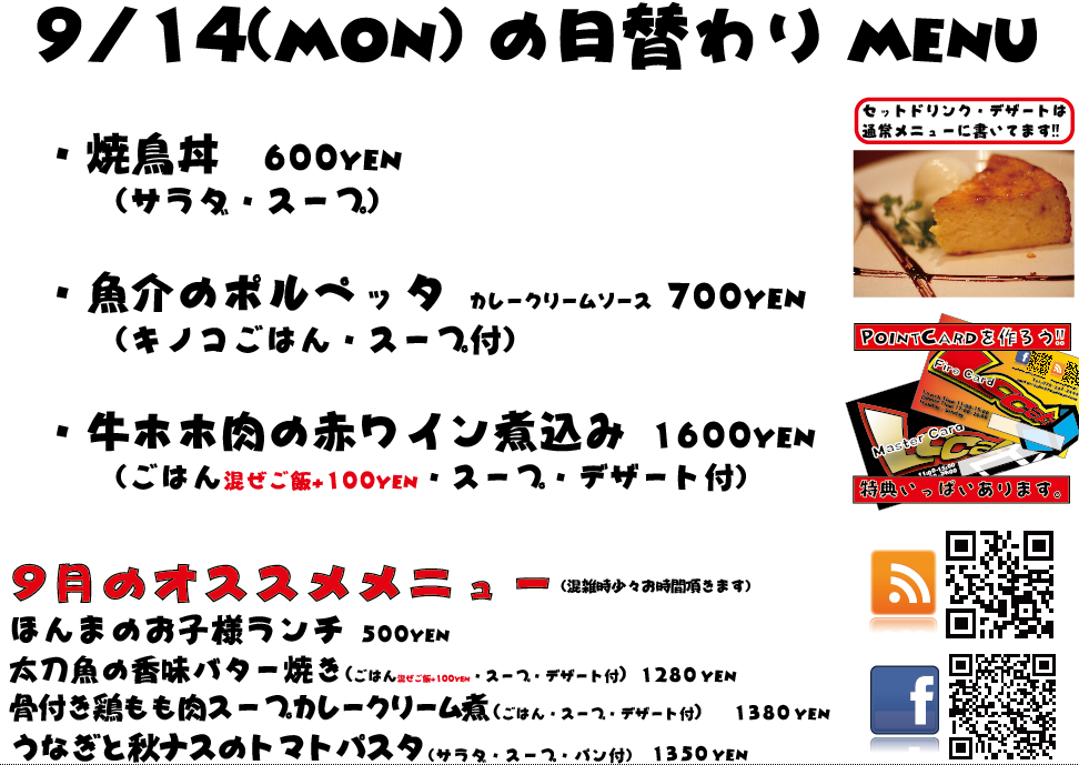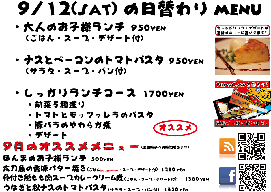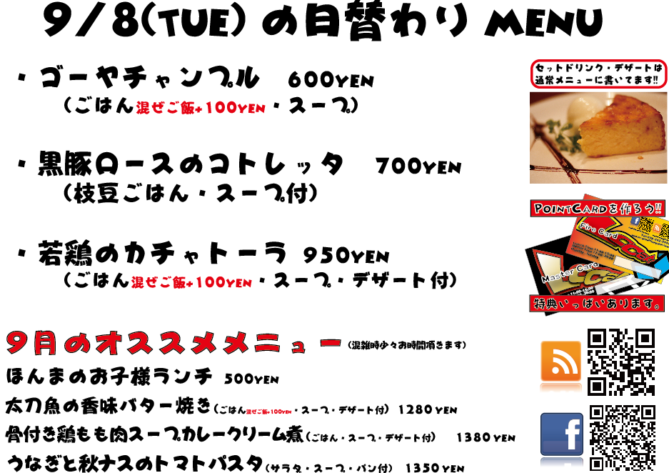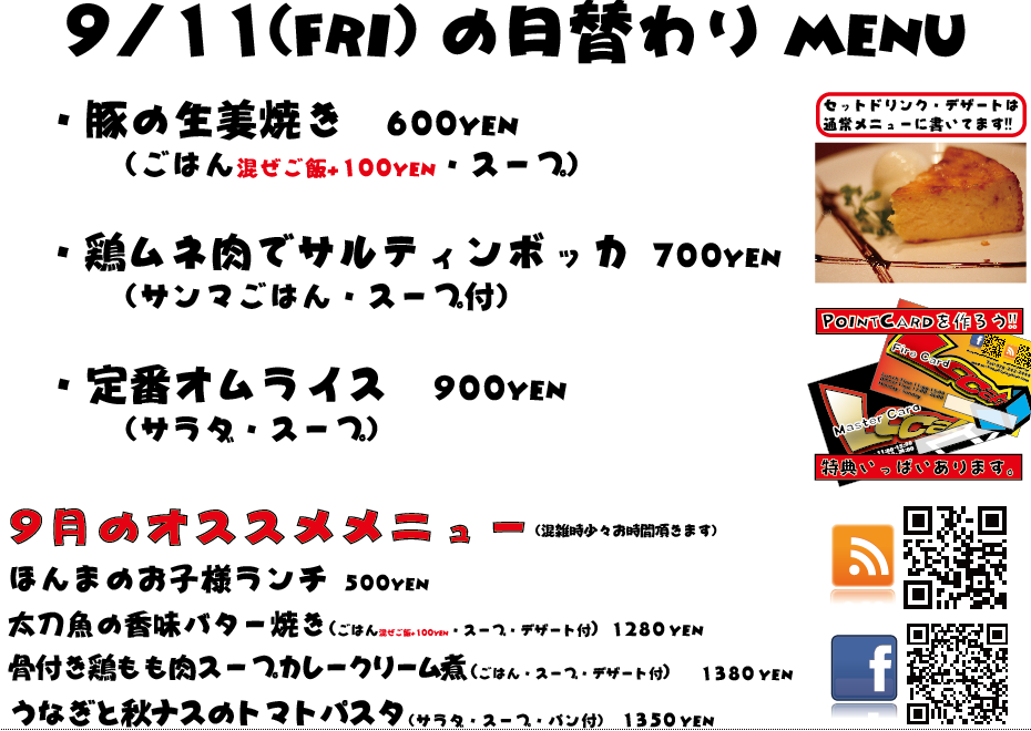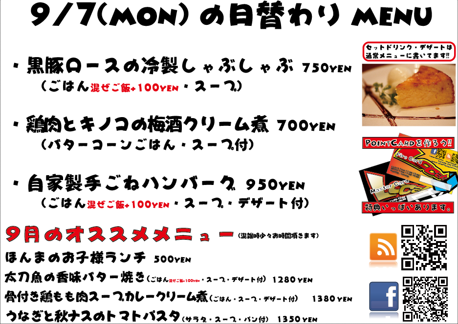 JUGEMテーマ:神戸・西宮・芦屋などの阪神間 こんばんは 今日もありがとうございましたー!この週末はのんびりしてましたねっ!(泣 明日は日曜定休日を頂戴しております、よろしくお願い致しますm(._.)m こちらの日替わりメニューは9/7のメニューでございます