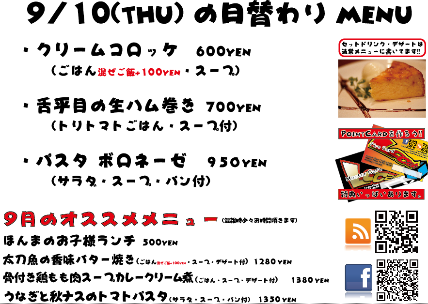 JUGEMテーマ:神戸・西宮・芦屋などの阪神間 こんばんは 今日もありがとうございました 遅くなってしまいましたが、明日の日替わりランチでございます、よろしくお願い致します。 夜・朝がだいぶ涼しくなってきましたので、風邪などにはお気をつけて〜〜^^