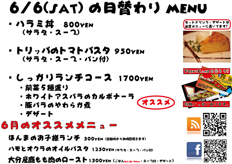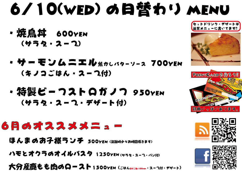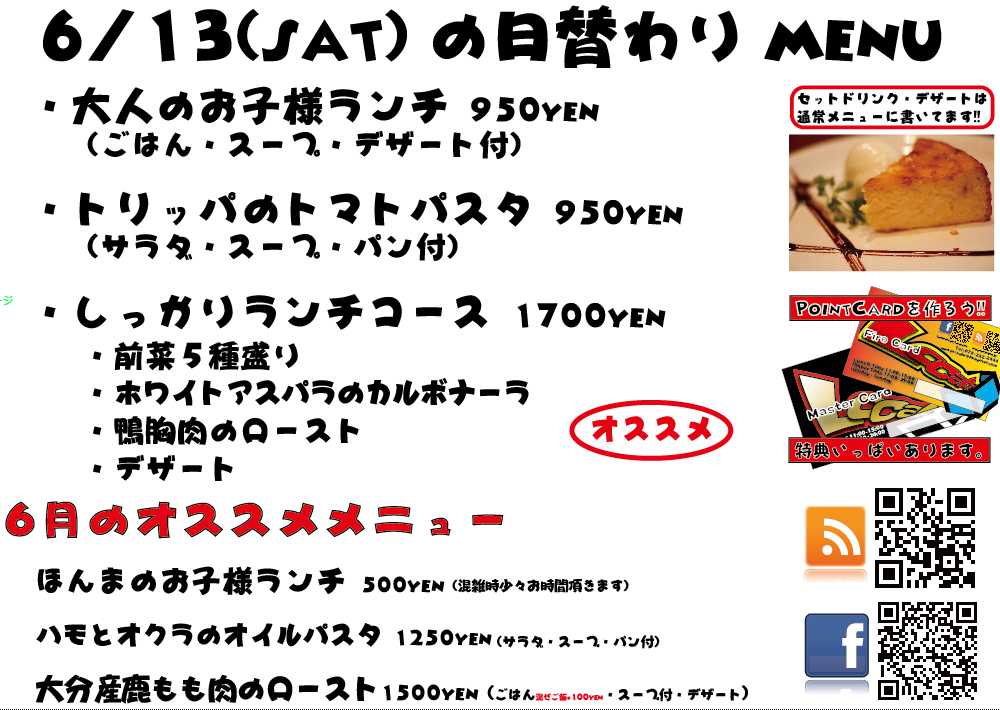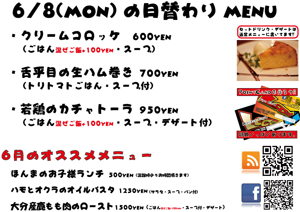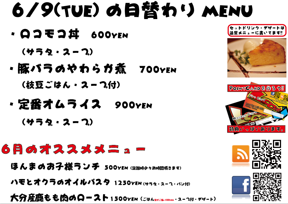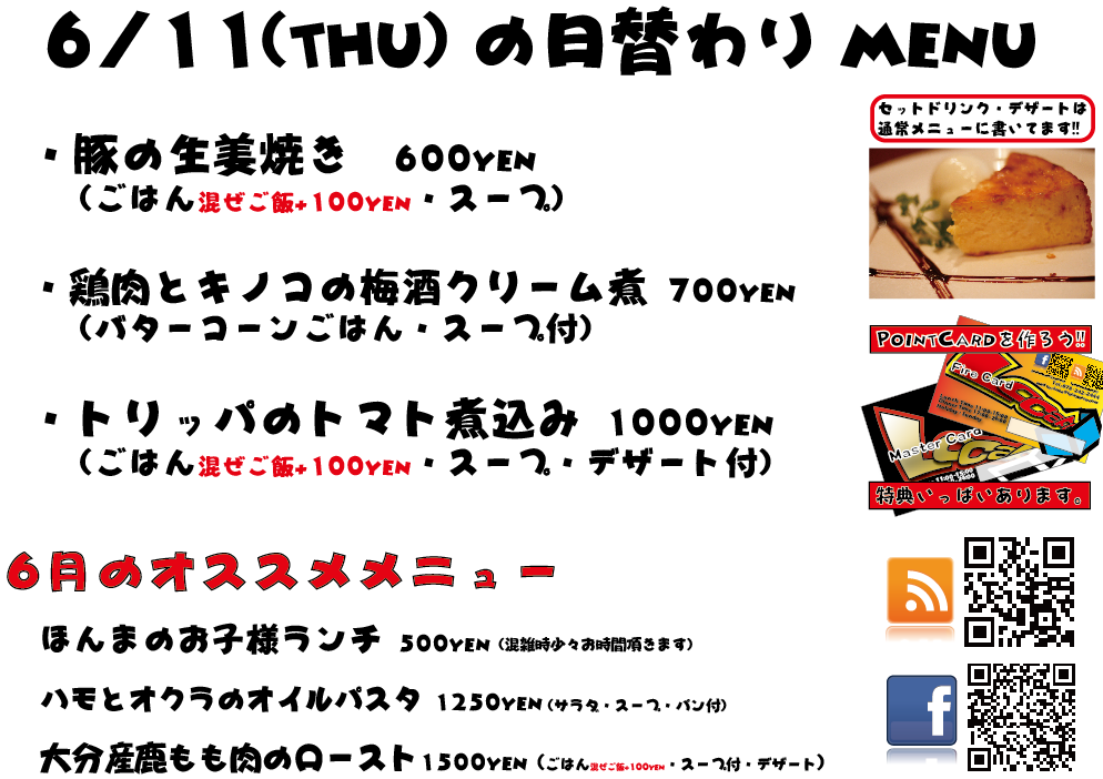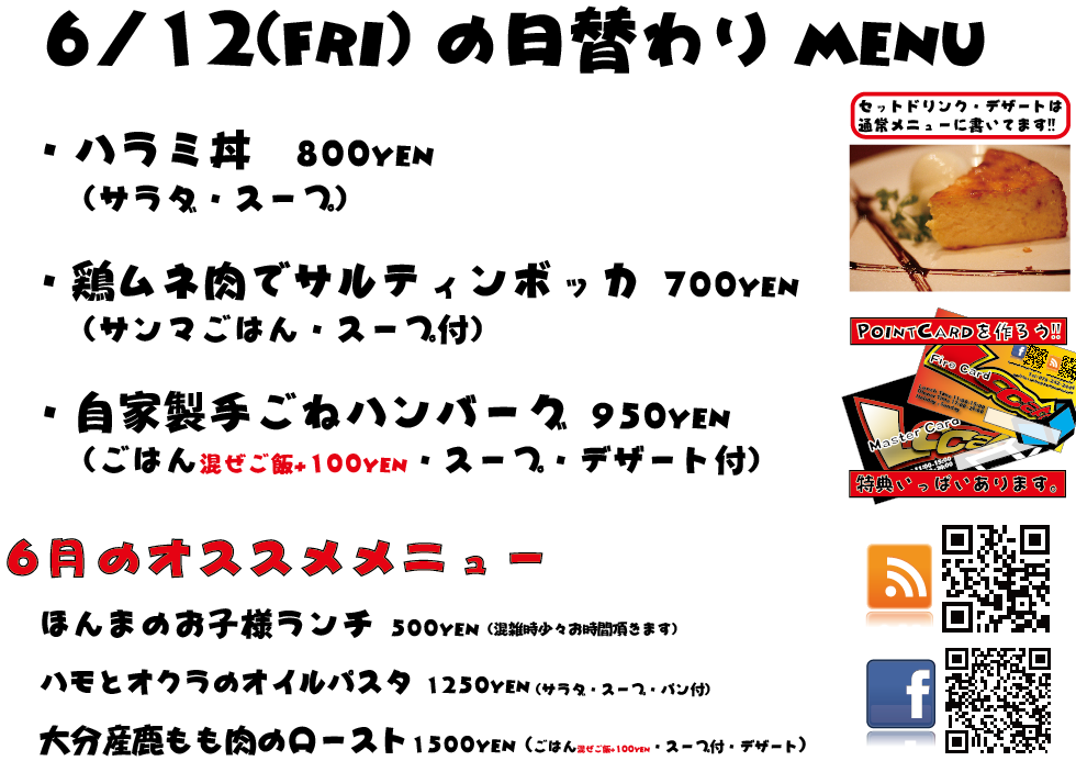 JUGEMテーマ:神戸・西宮・芦屋などの阪神間 こんばんは 今日もありがとうございました^^ 今日はわりと涼しい1日だったのではないでしょうか? 明日はお昼から雨が降りそうですねぇ...わたくし、降らないと信じておりますがw 明日は週末でございます、皆様ぜひおまちしております〜 あと 本日より、食べログのワンコインランチを開始しております、よろしくお願い致します
