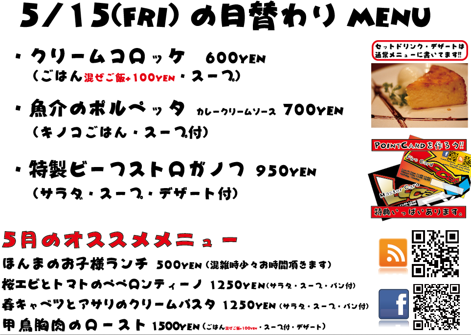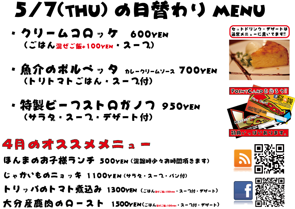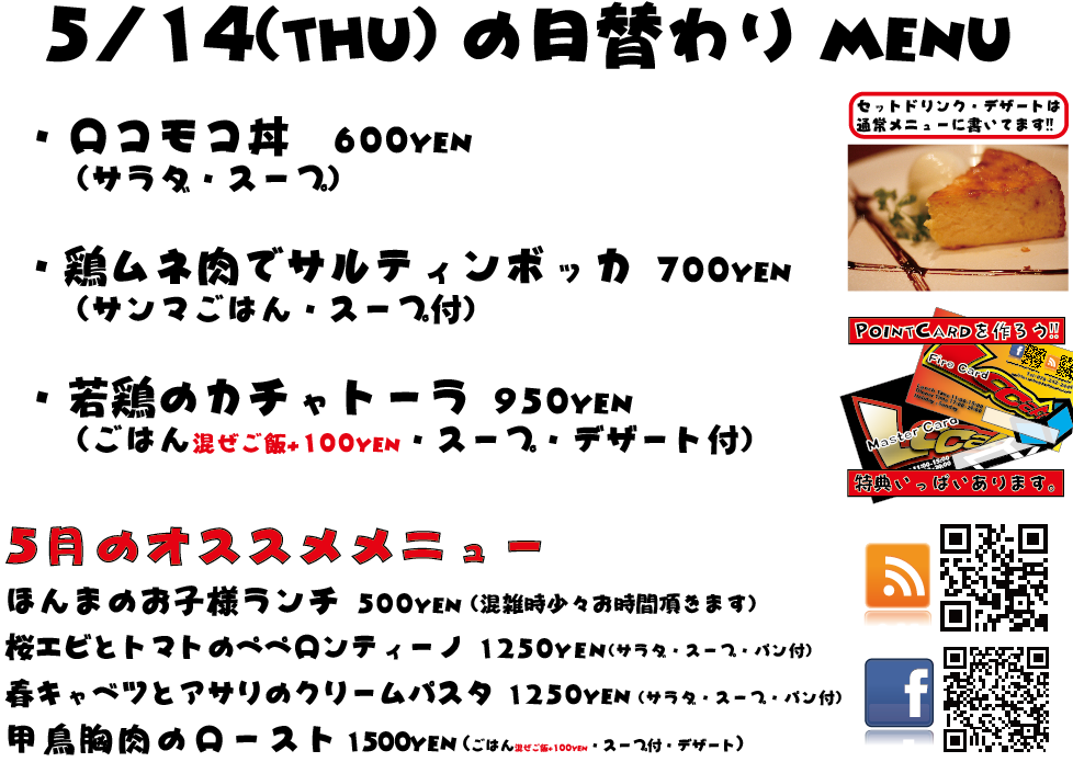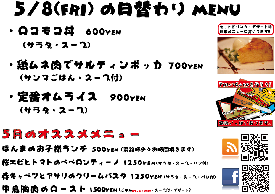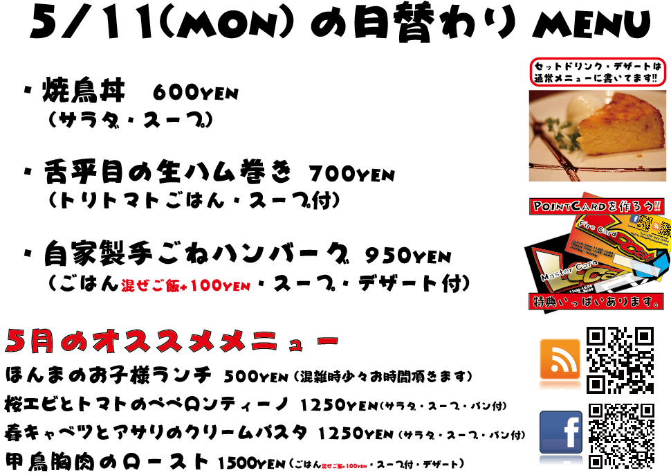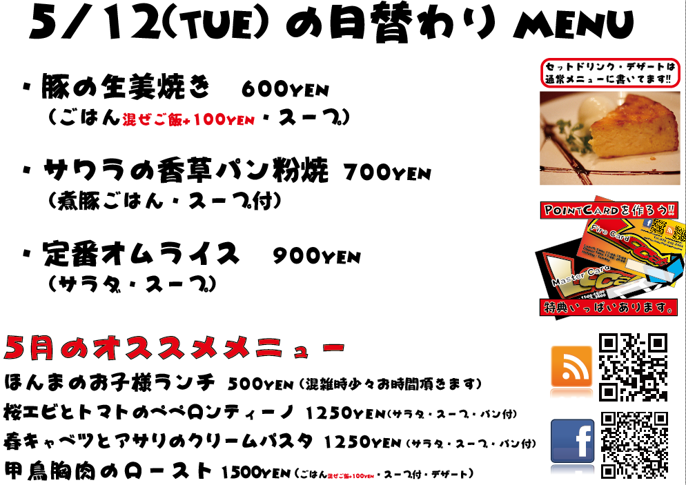 JUGEMテーマ:神戸・西宮・芦屋などの阪神間 こんばんは 昨日はお休みいただきましてありがとうございましたm(._.)m しっかり休養できたと...思いますっ 遅くなりましたが明日の日替わりランチでございます、よろしくお願い致します なお、明後日5/13(wed)のLunch営業は誠に勝手ながらお休みを頂戴致します、よろしくお願い致しますm(._.)m