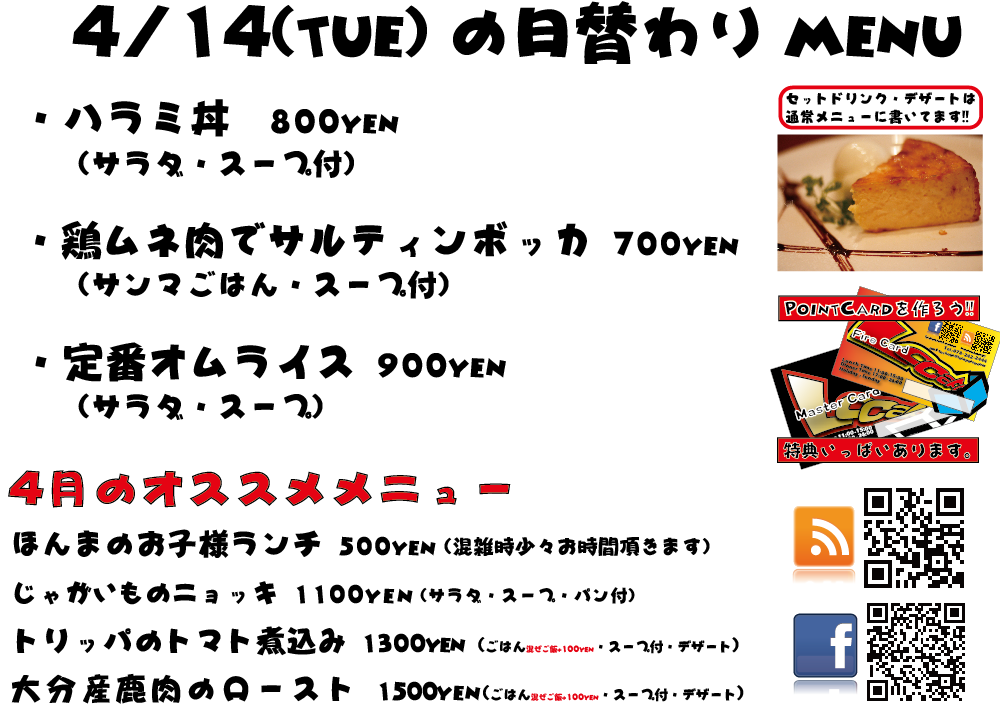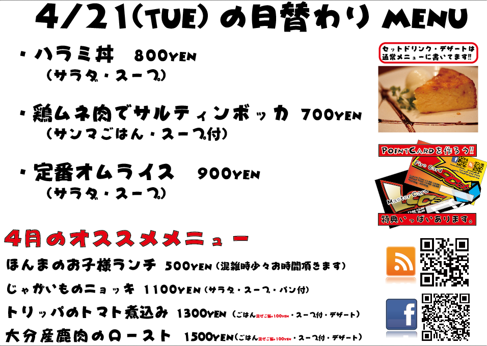 JUGEMテーマ:神戸・西宮・芦屋などの阪神間 こんばんは 昨日はお休みいただきましてありがとうございました! しっかり充電させて頂きました 今週もがんばります!よろしくお願い致しますm(._.)m Lunchメニュー下部の「オススメ」 4月から変わっております、ぜひ