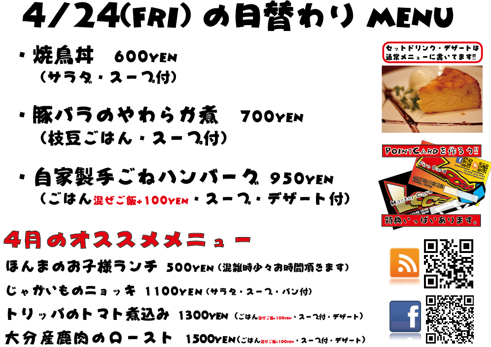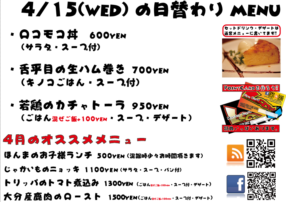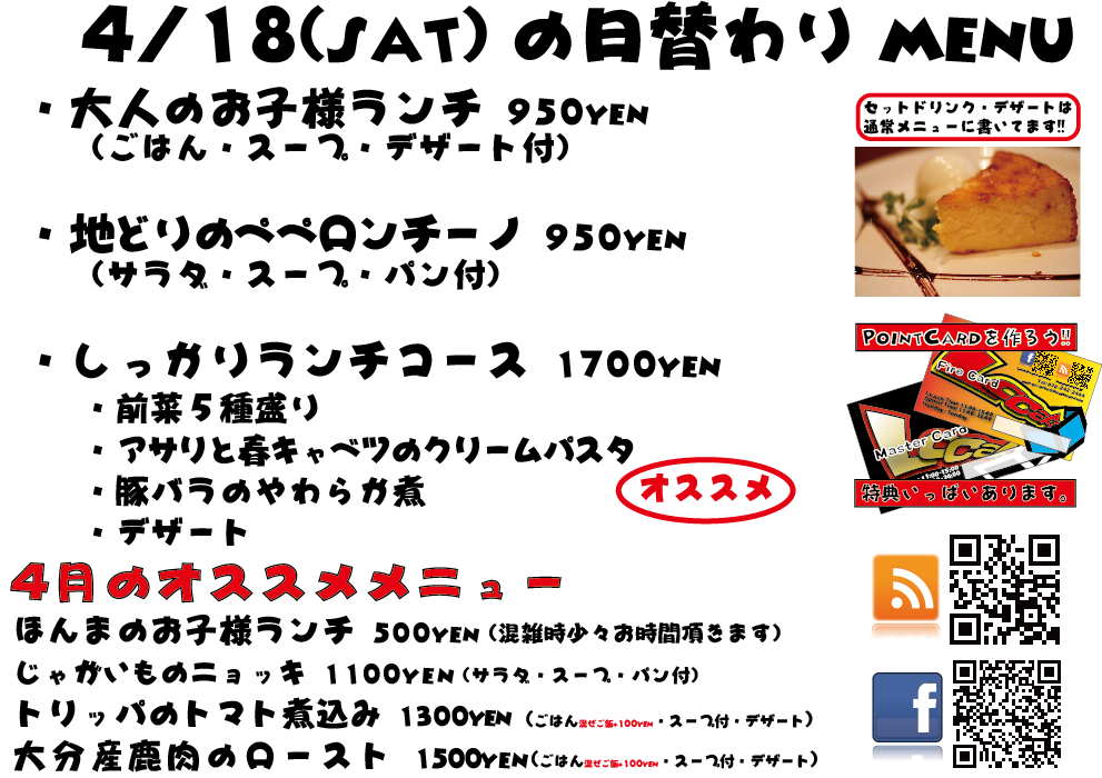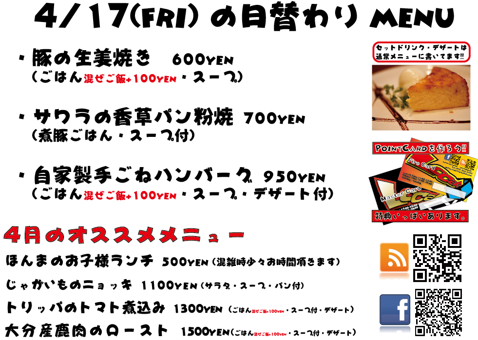 JUGEMテーマ:神戸・西宮・芦屋などの阪神間 こんばんは、遅くなってしまいましたが、明日の日替わりランチでございます! この後、GWの日程発表でございます