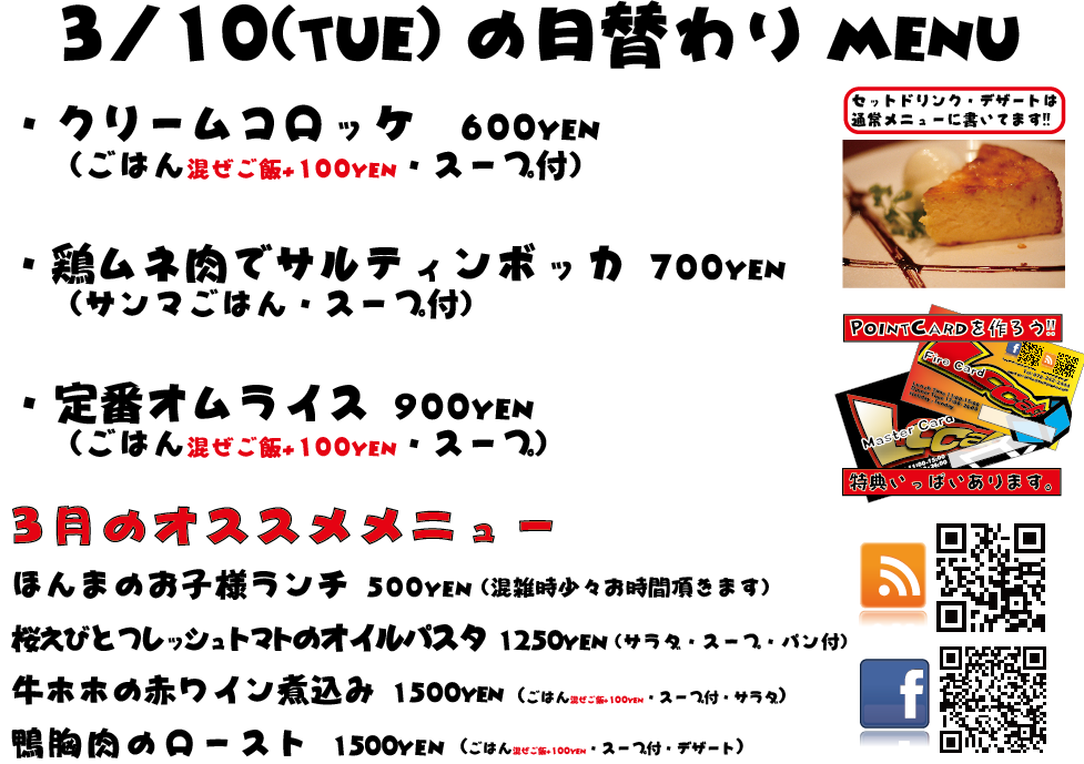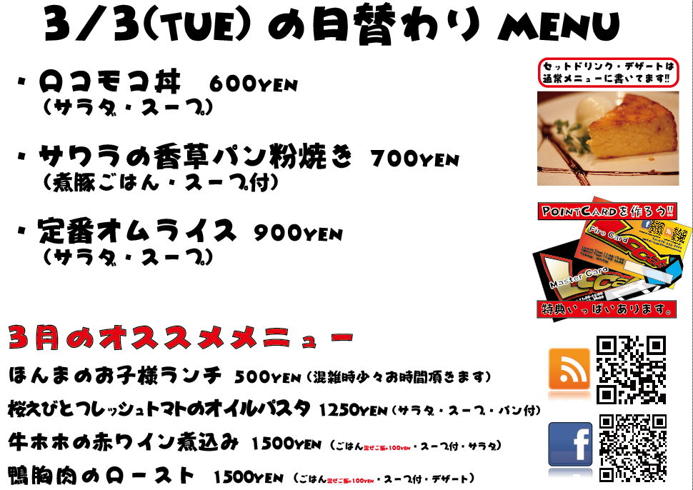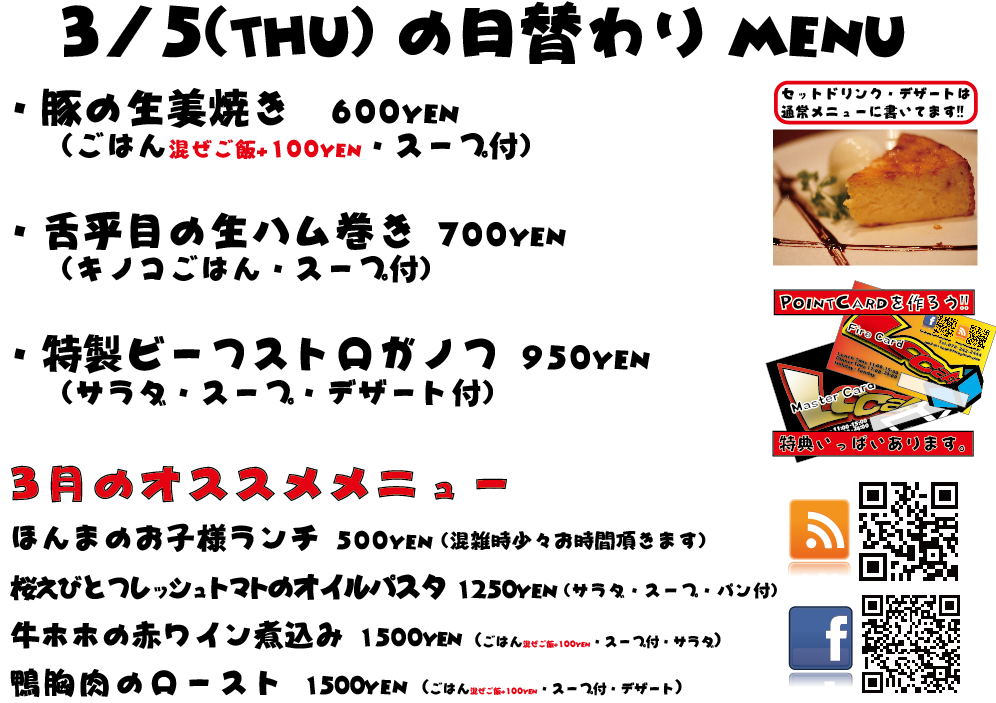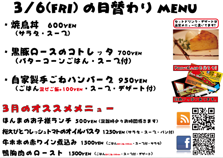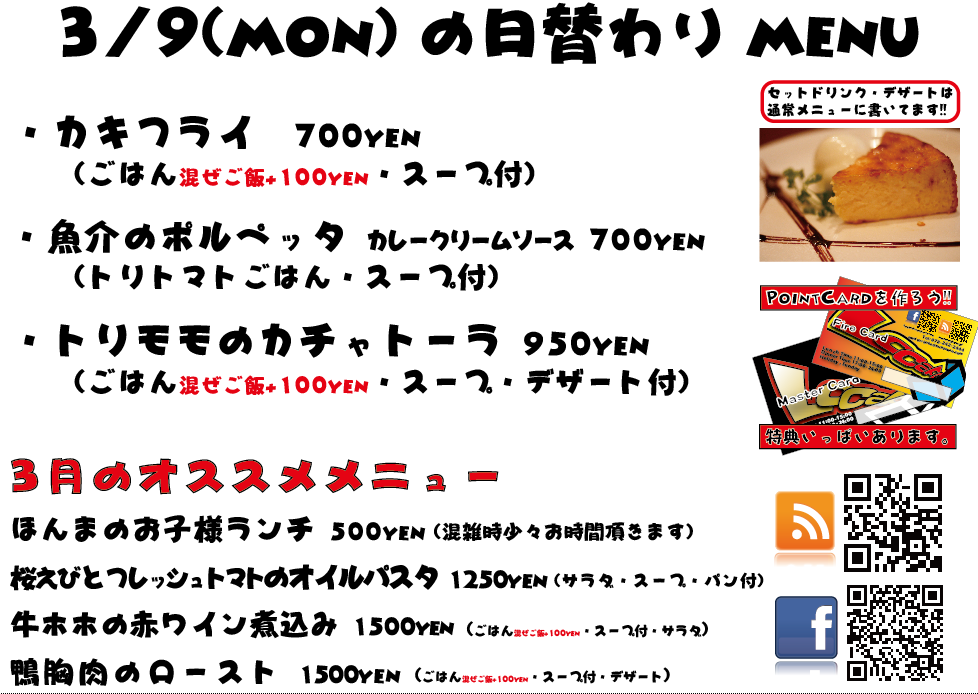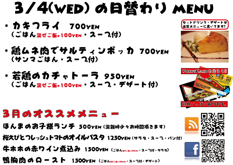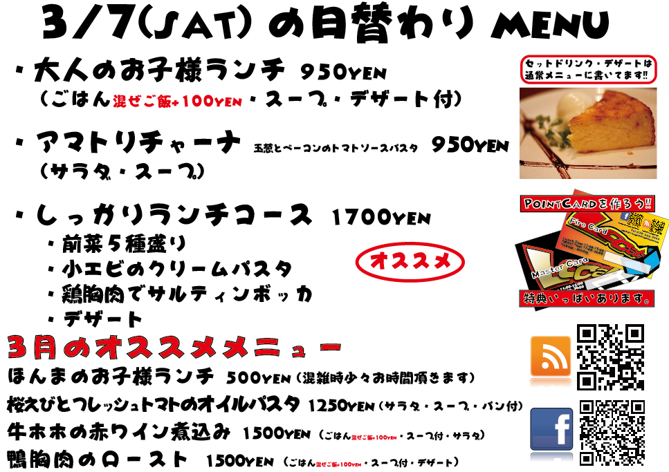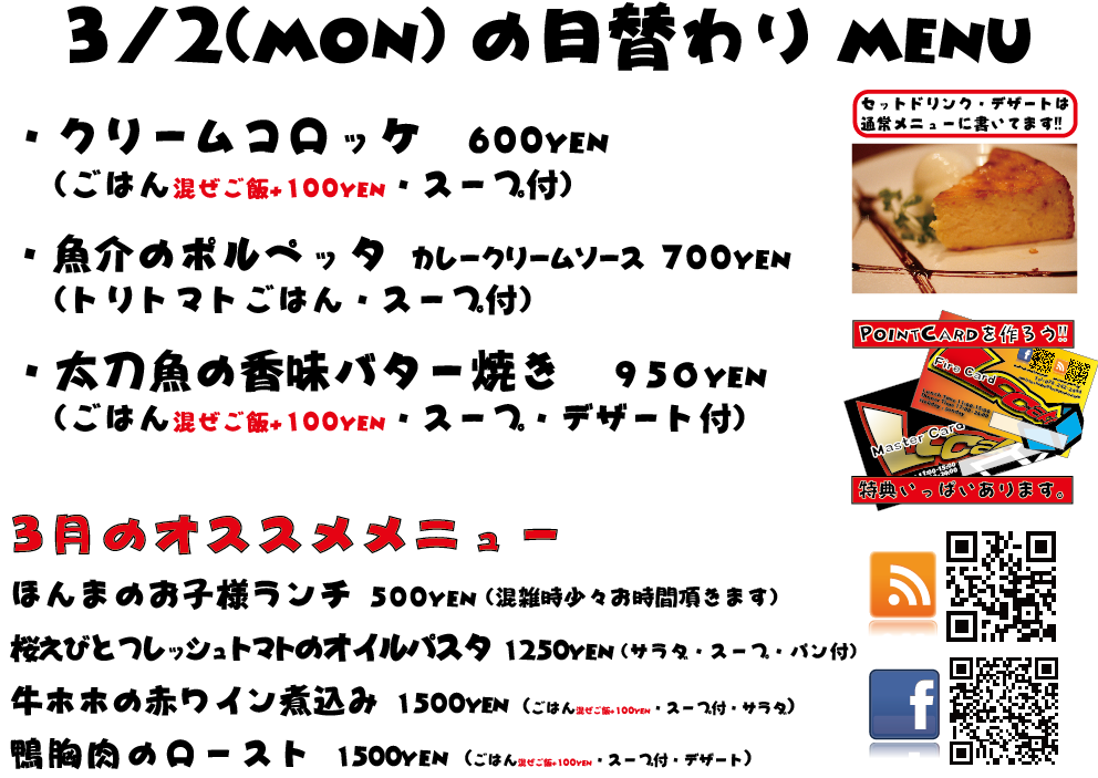 JUGEMテーマ:神戸・西宮・芦屋などの阪神間 こんばんは 今日もありがとうございました^^ 3月もがんばってまいりますのでぜひよろしくお願いいたしますm(._.)m 明日の日替わりランチはこちらになっております