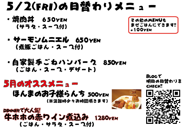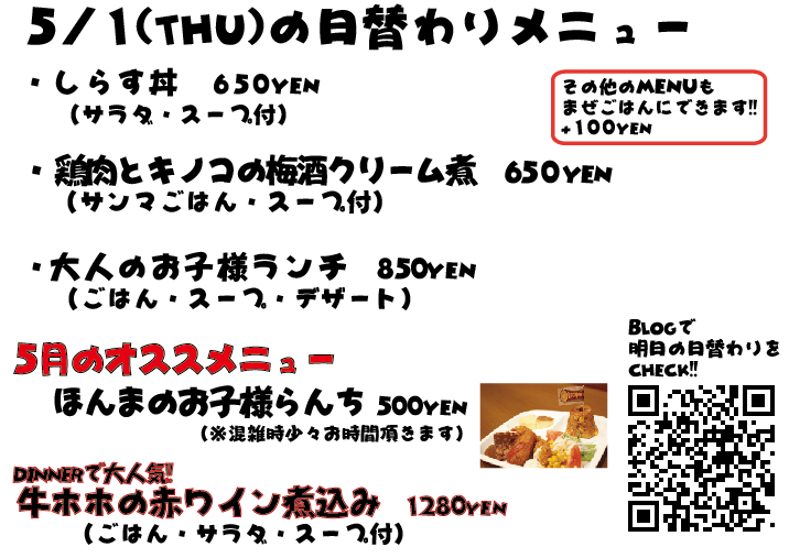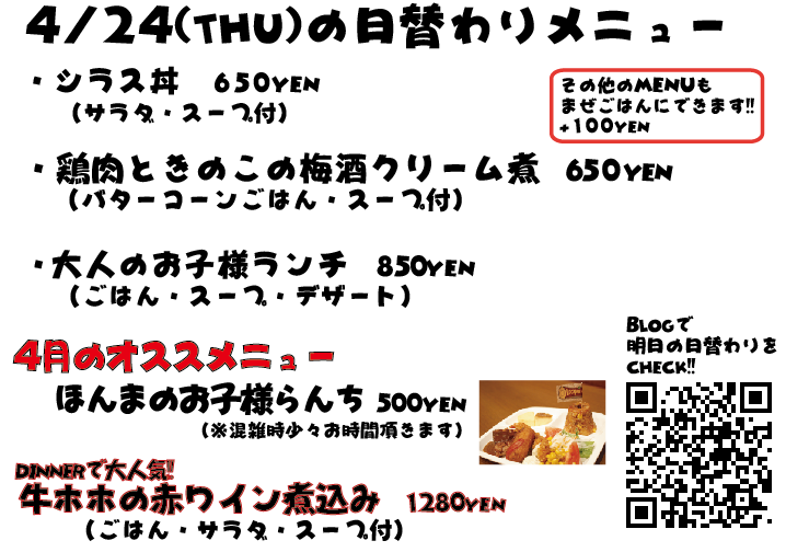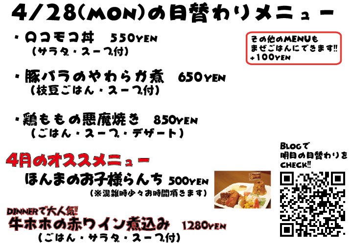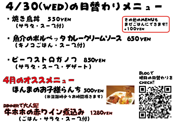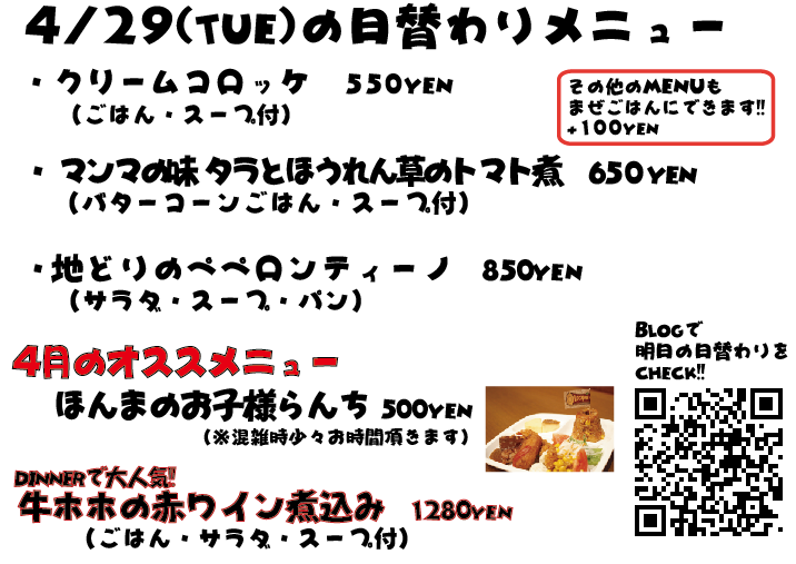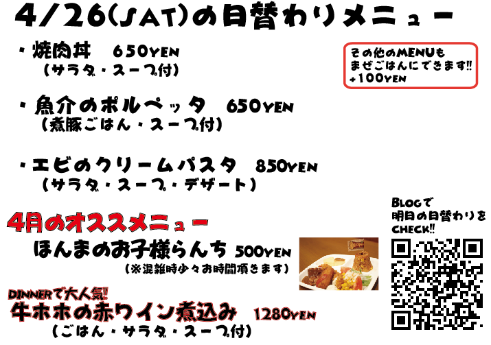 JUGEMテーマ:神戸・西宮・芦屋などの阪神間 こんばんは 今日は暖かかったですね!久しぶりだったのではないでしょうか? 大変もうしわけございませんが、明日の日替わりランチはお休みさせて頂きます ですので、本日は明後日4/26(sat)の日替わりランチのお知らせでございます よろしくお願い致します