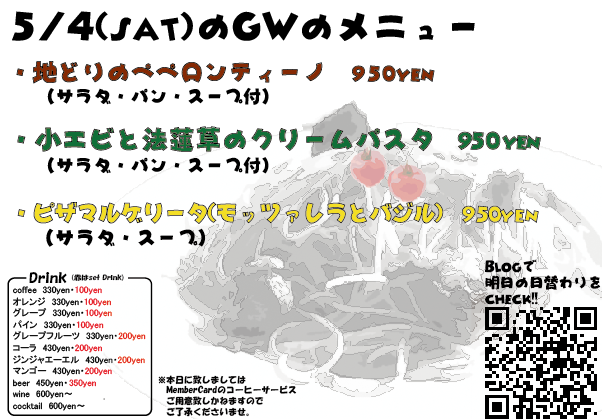 JUGEMテーマ:神戸・西宮・芦屋などの阪神間 こんばんは またまた遅くなってしまいましたが、明日もGWパスタランチセットでございます よろしくお願い致しますm(._.)m