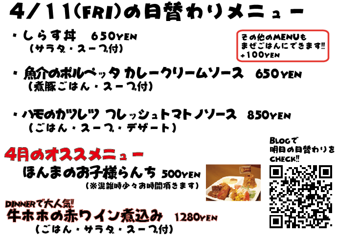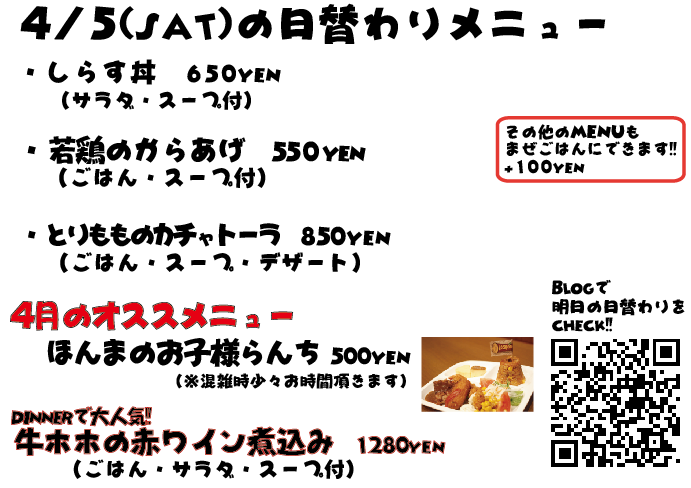 JUGEMテーマ:神戸・西宮・芦屋などの阪神間 こんばんは 今日の緊急特別企画、『ホタルイカと渦潮トマトのペペロンチーノ』完売御礼ありがとうございました ホタルイカは春が旬でございます。これからもホタルイカの特別企画、あると思いますのでぜひ 明日の日替わりランチは普段日替わりランチに登場しないからあげでございます どうぞよろしくお願い致しますm(._.)m