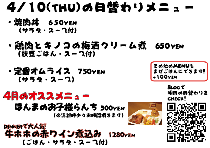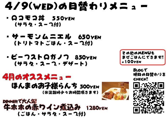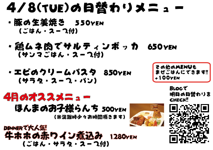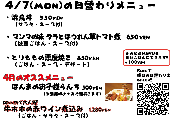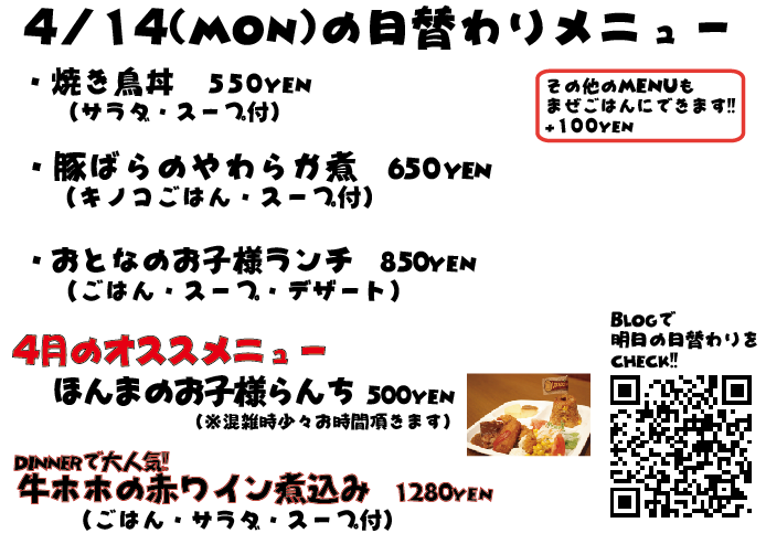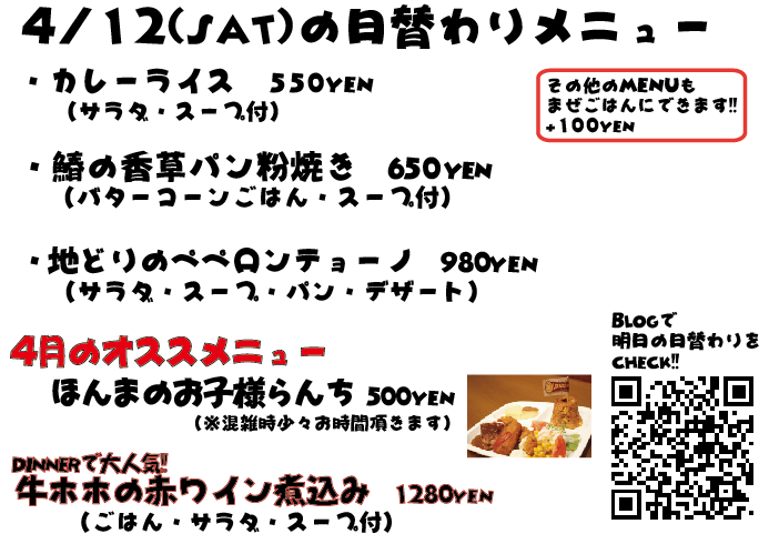 JUGEMテーマ:神戸・西宮・芦屋などの阪神間 こんばんは 昨年の、6月か9月から日替わりメニューのお知らせのBlogをFBページなどに絡めてUPさせて頂いておりますが... なぜか昨日のアクセスがものすごいアクセス数(個人的に)だったのです 記事を読み返して見ると『競馬』の話でしたが...『競馬』のキーワードにひっかかったのか...分からないものですw そんな分からない感じですが、明日の日替わりランチもよろしくお願い致しますw