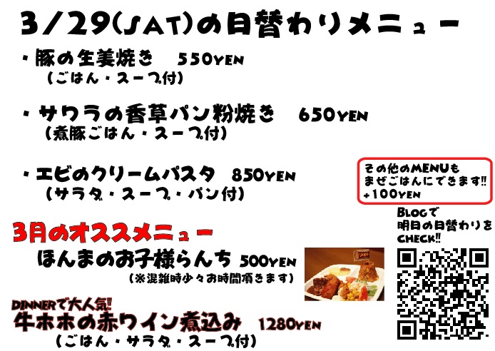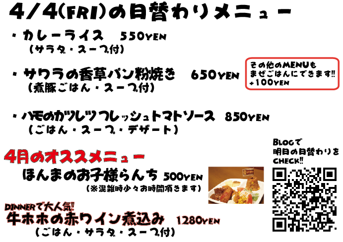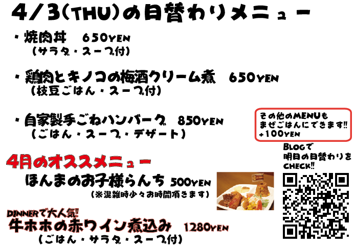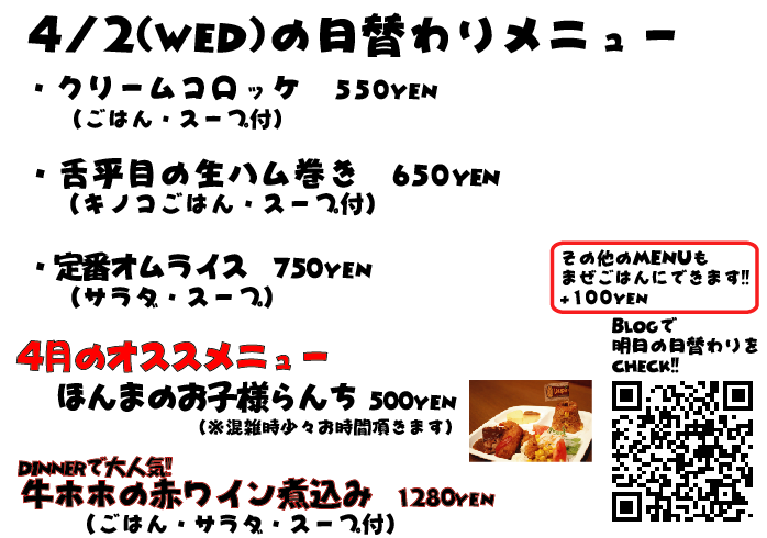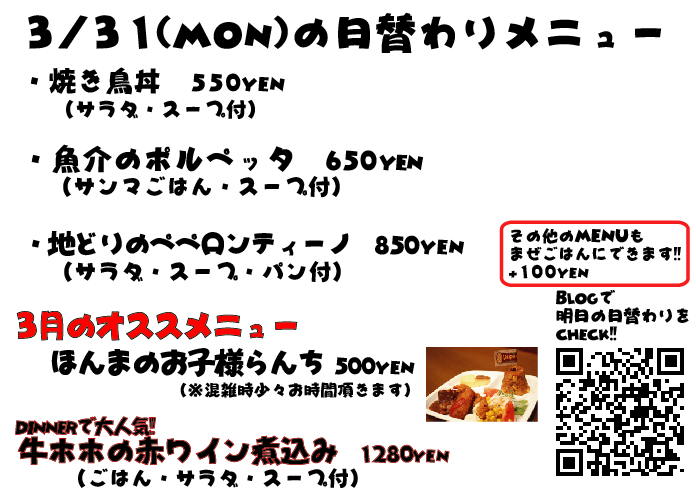JUGEMテーマ:神戸・西宮・芦屋などの阪神間 こんばんは 今日で3月も終わってしまいましたが、いかがでしょうか? 3月は飲食店問わず、色んな業種から「暇だ暇だ」と聞いていましたが、4月からは皆さん忙しくなりますよ〜に〜! それでは明日の日替わりランチもぜひよろしくお願い致します
