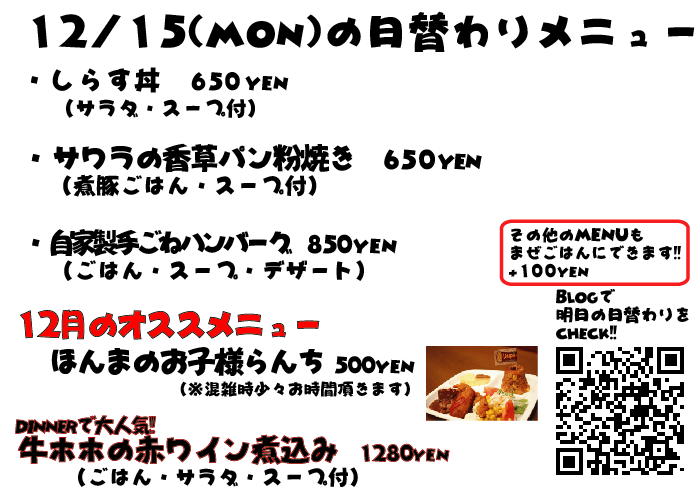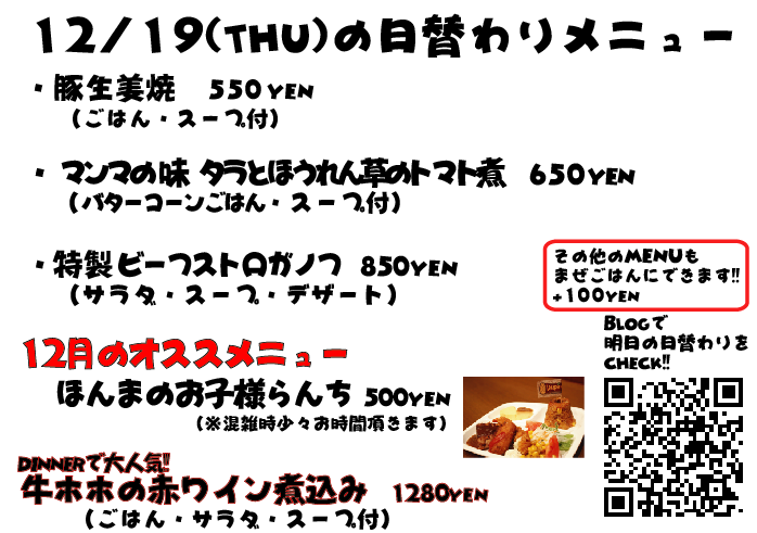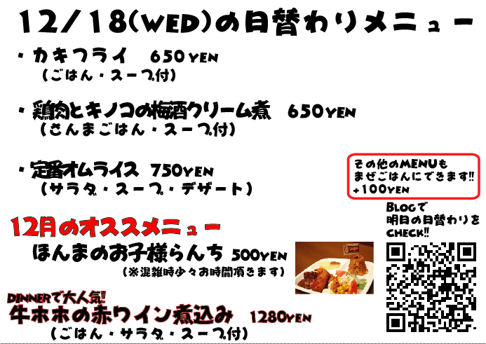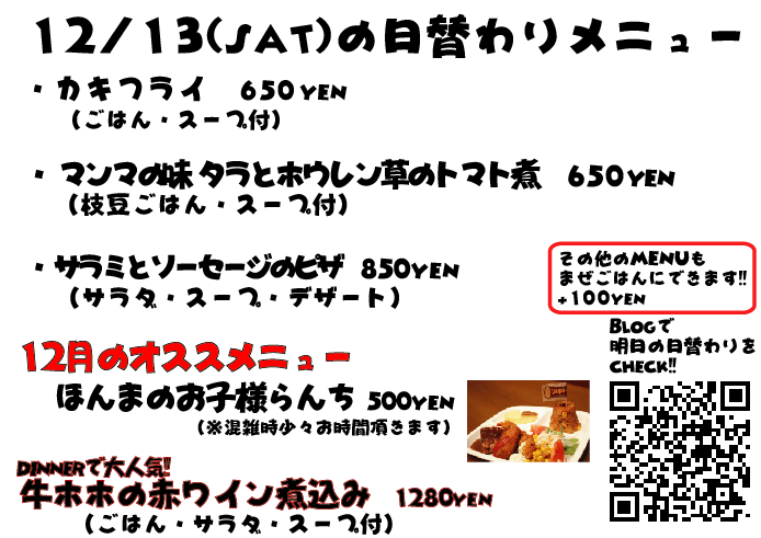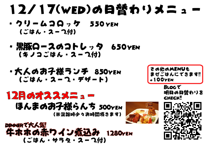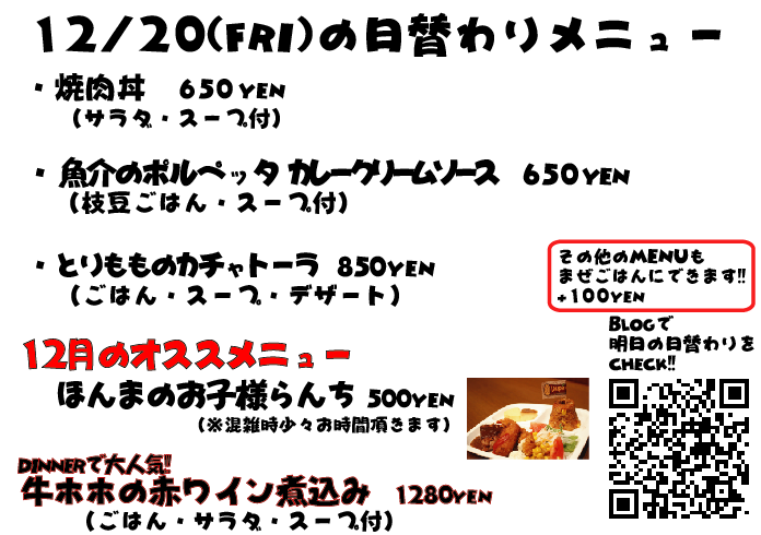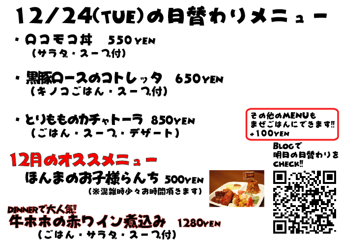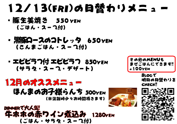 JUGEMテーマ:神戸・西宮・芦屋などの阪神間 こんばんは なぜか昨日の投稿、文章が全部消えている...なんでw しかも画像の曜日が間違っていました、すいませんでしたm(._.)m 今日のランチは観光のお客様がチラホラ ルミナリエを見に来たそうです^^ 毎年ルミナリエになると、各地からツアーバスとかご家族とかでルミナリエを見に来られてる方が多くなりますね 明日は金曜日、週末なんでルミナリエも人でいっぱいそうですが機会がありましたら是非