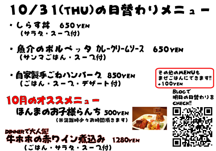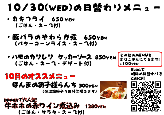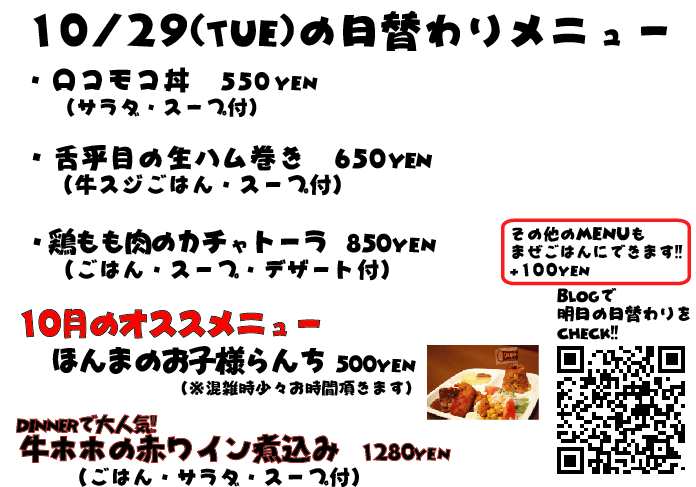 JUGEMテーマ:神戸・西宮・芦屋などの阪神間 こんばんは 明日で10月も終わりですね、早いです 今月最後の日替わりランチ、よろしくお願い致します