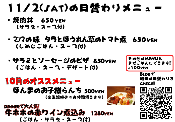 JUGEMテーマ:神戸・西宮・芦屋などの阪神間 こんばんは 本日、夕方に周年のお知らせをさせて頂きました→記事はこちら 来週末、よろしくお願いしますっ 明日から11月が始まります、だんだん寒くなってきて冬っぽくなってきましたね^^ 日替わりランチ、よろしくお願い致します
