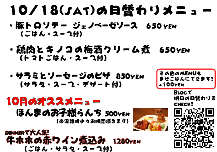 JUGEMテーマ:神戸・西宮・芦屋などの阪神間 こんばんは 今日はものっそのんびりしてますね、山手幹線もまったく人が歩いてない感じでw 台風27,28号、25日辺りにどっちかきそうな感じ...って明後日やーん! 明日の日替わりランチ、よろしくお願い致します