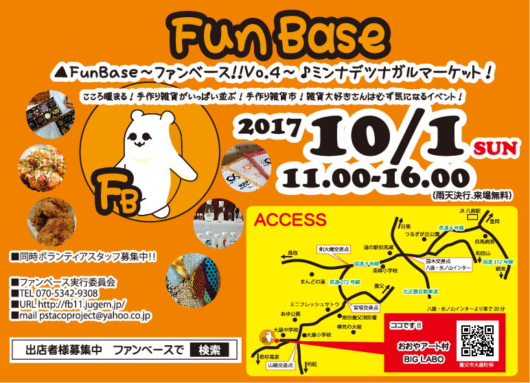 JUGEMテーマ:イベント、出店、募集 FunBase〜ファンベース!!Vo.4+ミンナガツナガルマーケットinおおやアート村 BIG LABO 今回は!おおやアート村 BIG LABOの開催です!! あの有名な!!ラボで開催になります♪ なんと同日に明延銀山にて1円電車まつりを開催されていますー!!! これは立ち寄られるお客様も多数おられると思われます ロケーションサイコ-〜♪ 日時:2017年10月1日(日) 11:00〜16:00 会場:おおやアート村 BIG LABO(雨天決行) 場所 兵庫県養父市大屋町加...