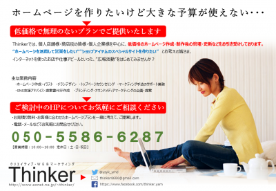 こんにちは!滋賀県湖北にあるホームページ、WEBマーケティングを専門にご提案をしています、 Thinker〜〜〜で〜〜ございます。 いや、別にヘンなSEO対策ではありませんのでご心配なく。 少しづつではありますが、事業運営の準備も進んできて、1つづつサービスメニューも作っていかなければいけません。 今日はその宣伝にグログを使いたいと思います。 Thinkerは、ライトHPプランというサービスを始めます!まずこれは、滋賀県にある個人店舗様・商店街の皆様・個人企業様を中心に、低価格のホームページ作成をご提案する...