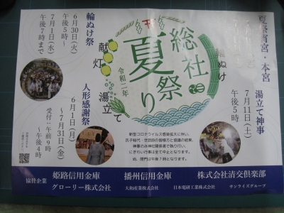 JUGEMテーマ:姫路市 新型コロナウィルス感染症拡大に伴い、氏子代表 、世話係の皆様と協議の結果、神事のみ神社関係者 で執り行い、にぎわい行事は全て中止と成ります。 なお閉門は午後7時と成ります。 とのお知らせがありました。 輪ぬけ祭りについては、大茅の輪が境内に に設置されています。 勝手に西二階町商店街の飲食店を応援しよう! 8回目 花そば・料理 ゆう さんのお弁当...