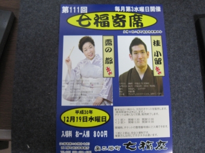 JUGEMテーマ:姫路市 毎月恒例の七福寄席、12月講演のお二方です。入場券は発売中。売り切れm(__)mの早いのもの勝ちです。席順も入場券の番号順です。西二階町で協賛し、入場券は、お得が付いています。詳しくは、七福寄席で( ^)o(^ )。 姫路城より長い歴史を持つ姫路なめし(皮を革にする作業)の姫路縫製のカワイイ、カラフルな革製品を販売中。 (平安後期の法令集の「延喜式」にも播磨の革の記述があり、特に馬革は生産が1番多い記述があります。長い歴史とヨーロッパの皮革の見本市で賞を受賞す...