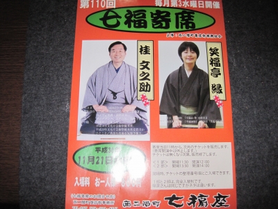 JUGEMテーマ:姫路市 11月も第三水曜日に七福寄席あります。 桂 文之助 さん笑福亭 縁さん です。午前11時、午後1時30分の2回公演、各回800円で2席、楽しんで頂けます。 笑っていると、楽しく成ったり、元気に成ったりするそうです。疲れているときにも是非。 当日県の無い場合が、多々あります。七福座で前もって購入下さい。 七福座では、七福寄席の様な玄人の噺家から研鑽を積んだ方々の素人寄席、はたまた名の通った師匠の寄席まで毎月何回もの寄席が開催されています。 ...