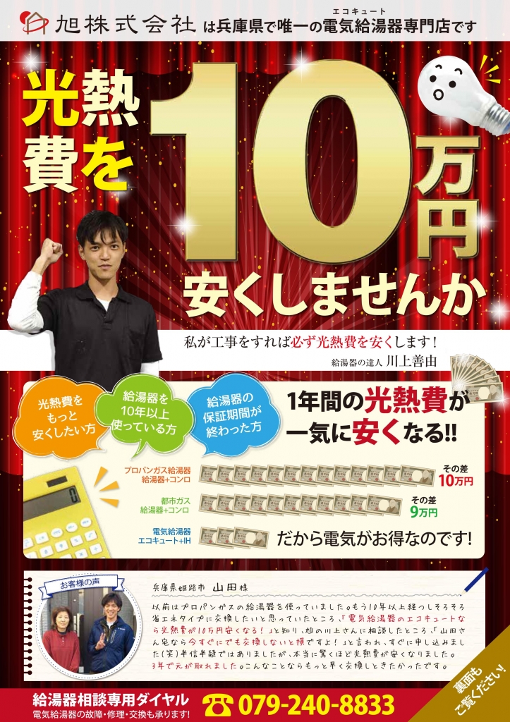 JUGEMテーマ:姫路市 オール電化、エコキュート、給湯器、IHクッキングヒーターの交換故障修理専門の兵庫県姫路市、旭株式会社の川上です。 毎回大反響の「光熱費を10万円やすくしませんか」が本日神戸新聞朝刊に入りました! 灯油やガス給湯器ご利用のお客様は465000円そこから10年保証無料プレゼント!さらに5万円で今お使いの給湯器下取りします! IH不要なら355000円で超省エネ電気給湯器のエコキュートにお取替えが可能です!(工事費コミコミ) 大多数のお客様は3〜5年程で元が取れますよ〜! ...