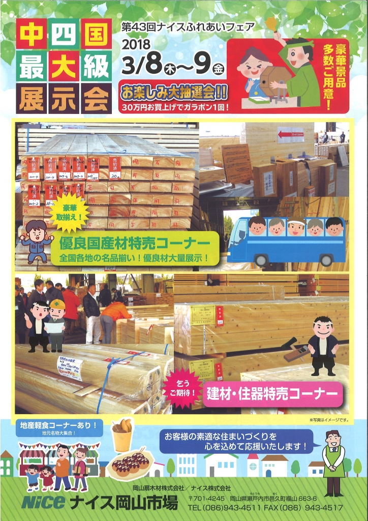 2018年3月8日(木)〜9日(金) AM9:00〜PM4:00 (両日とも) NICE ナイス岡山市場様(岡山県瀬戸内市邑久町福山663-6)にて、中四国最大級の展示会が開催されます。 弊社も、長さ2,000mm×幅1,000mm×厚み149mm 赤松集成材のサンプルを出品いたします。 お近くの方は、ぜひお越しください。弊社は、集成材別注の専門工場として、皆様のお役に立てる工場を目指しております。 ■「あきらめる前にお電話ください!」他社で断られても弊社なら可能! ...