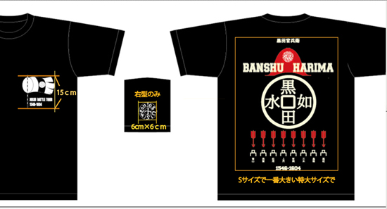 JUGEMテーマ:姫路市 黒田官兵衛戦国バトルTシャツの中でも特に姫路に関係の深い「播州播磨の戦い」の追加生産をすることになりましたので、この機会にデザインのバージョンアップを行いました。 今まで前の左胸にあった「シメオンマーク」を右肩に入れ、前胸には、白い気の立つときには、戦いに必ず勝つと言われた「大馬印」を入れました。 下記はTシャツプリントの説明画像です。6月発売の予定で進めています。 □関連ページ JOSUI BASTTLE TOUR ★ 黒田官兵衛戦国バトルTシャツ 「JOSUI BATTLE TOUR」