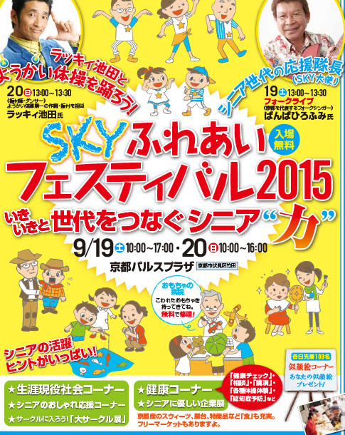 京都岩手県人会事務局です SKYふれあいフェステイバル2015が、いきいきと世代をつなぐシニア“力” のテーマで開催されます。 主 催 : 京都府、 (公財)京都スカイセンター、 (福)京都府社会福祉協議会 ほか と き : 9月19日(土)10〜17時、 9月20日(日)10〜16時 ところ : 京都パルスプラザ(伏見区竹田) 竹田駅からバス増便有、京都駅からバス直通有、駐車場有 すべての府民の健康保持・増進・ふれあい・生きがいの高揚を図り、 活力ある明るい長寿社会の実現を目指して開...